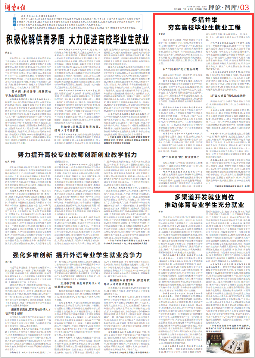 本网讯 8月21日,党委书记曾宝成在湖南日报理论版上发表题为《多措并举 夯实高校毕业生就业工程》的理论文章。