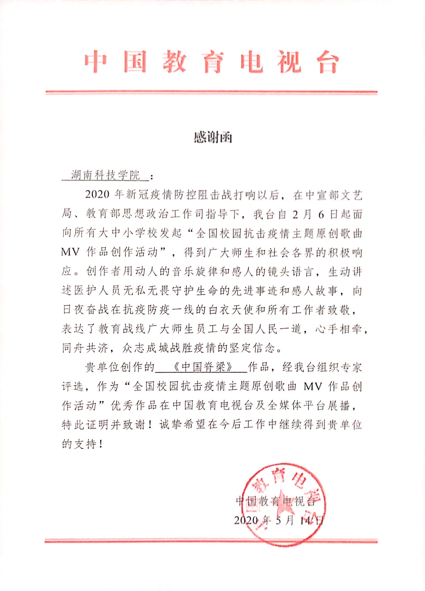 本网讯 5月21日,学校收到中国教育电视台发来的感谢函,由世界杯官网教师潘清远作词、方新佩作曲的音乐作品《中国脊梁》受到致谢。函中称,在中宣部文艺局、教育部思政司指导的“全国校园抗击疫情主题原创歌曲MV作品创作活动”中,《中国脊梁》被评选为优秀作品,并在中国教育电视台及全媒体平台展播。