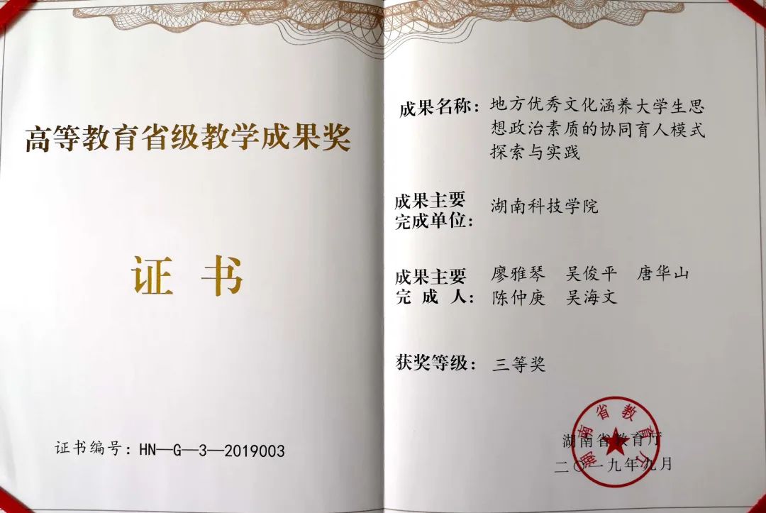 • 湖南省高校优秀教学成果奖1项