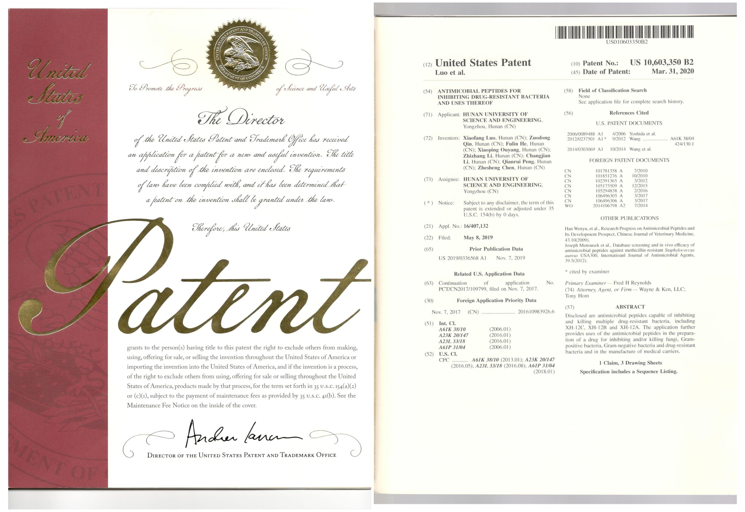 本网讯 近日,由世界杯官网覃佐东博士团队领衔的生化工程技术研究中心完成的技术发明成果获得国际授权,《ANTIMICOBIAL PEPTIDES FOR INHIBITING DRUG-RESISTANT BACTERIA AND USES THEREOF》(《抑制耐药细菌的抗菌肽及其用途》)(授权编号:US 10,603,350 B2 ),这是世界杯官网生物化工团队完成的技术发明专利成果首次获得国际授权。