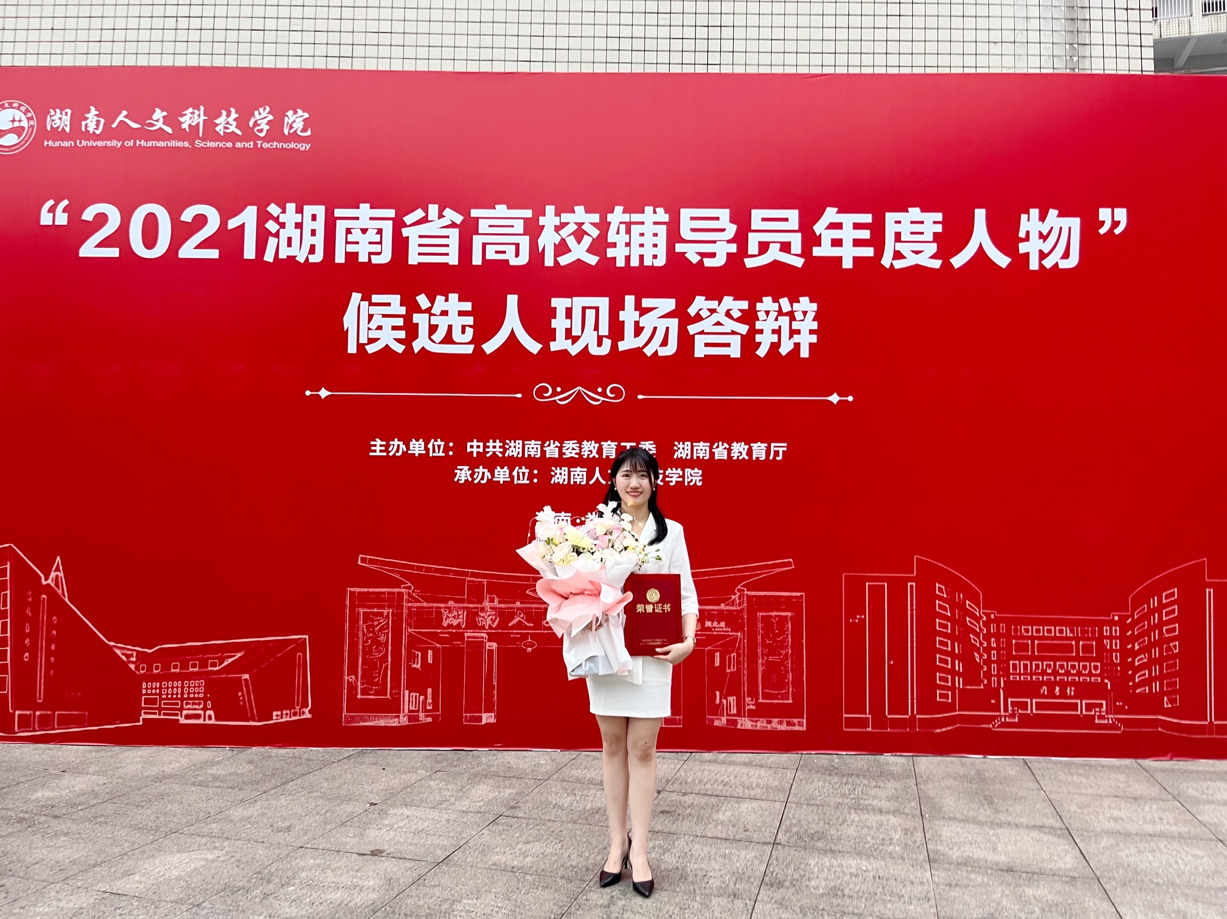 近日,由省委教育工委、省教育厅举办的“2021年湖南省高校辅导员年度人物”答辩评选活动结果揭晓,2026世界杯官方合作网站彭凡思以《“凡”心所向,当学生身边的“小红书”》为主题,针对学生的思想政治教育工作,分享了她的育人目标、育人思路和育人实效。凭借其扎实的理论功底、丰富的实践经验和良好的心理素质,获得了评委们的高度肯定,荣获“2021湖南省高校辅导员年度人物”。