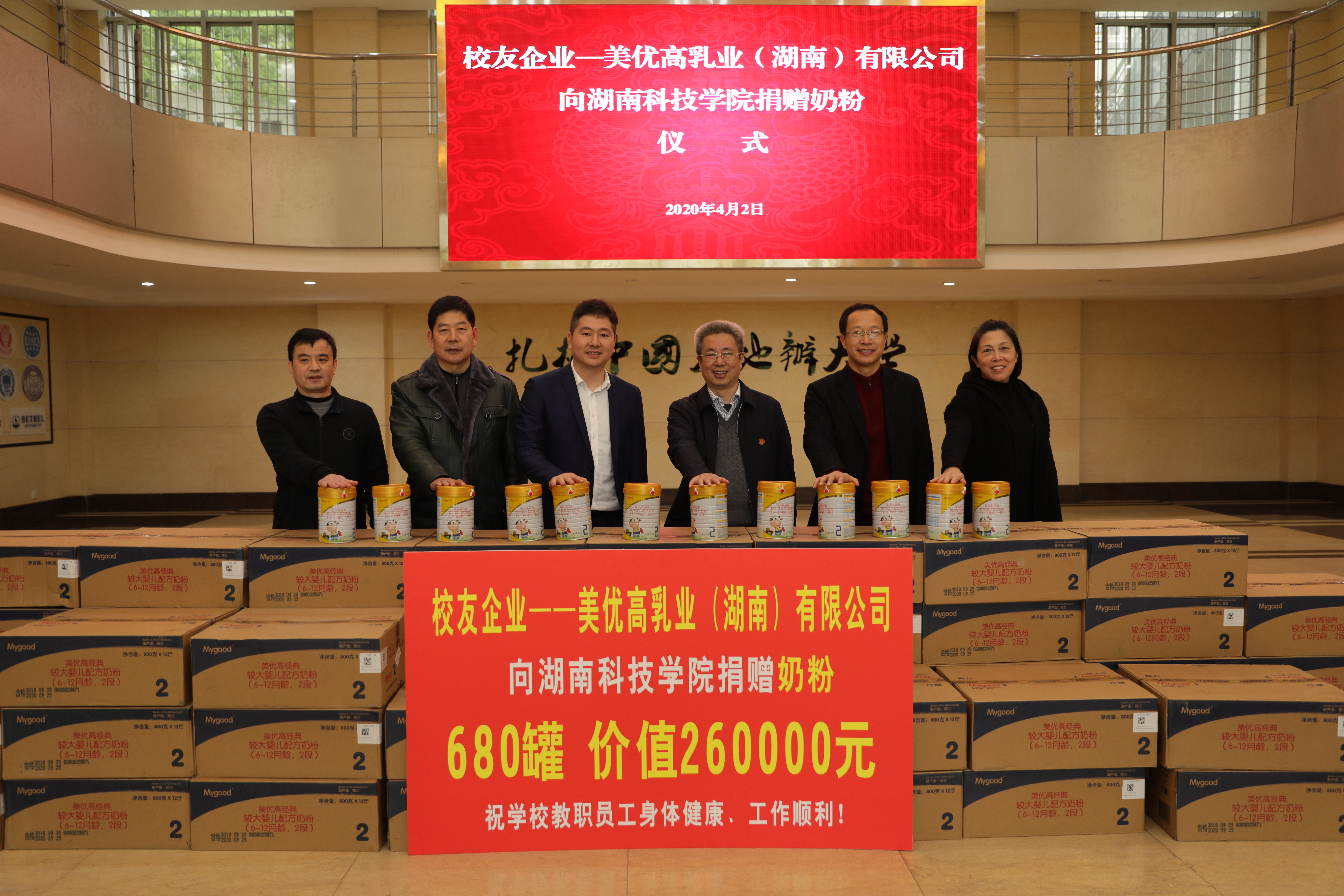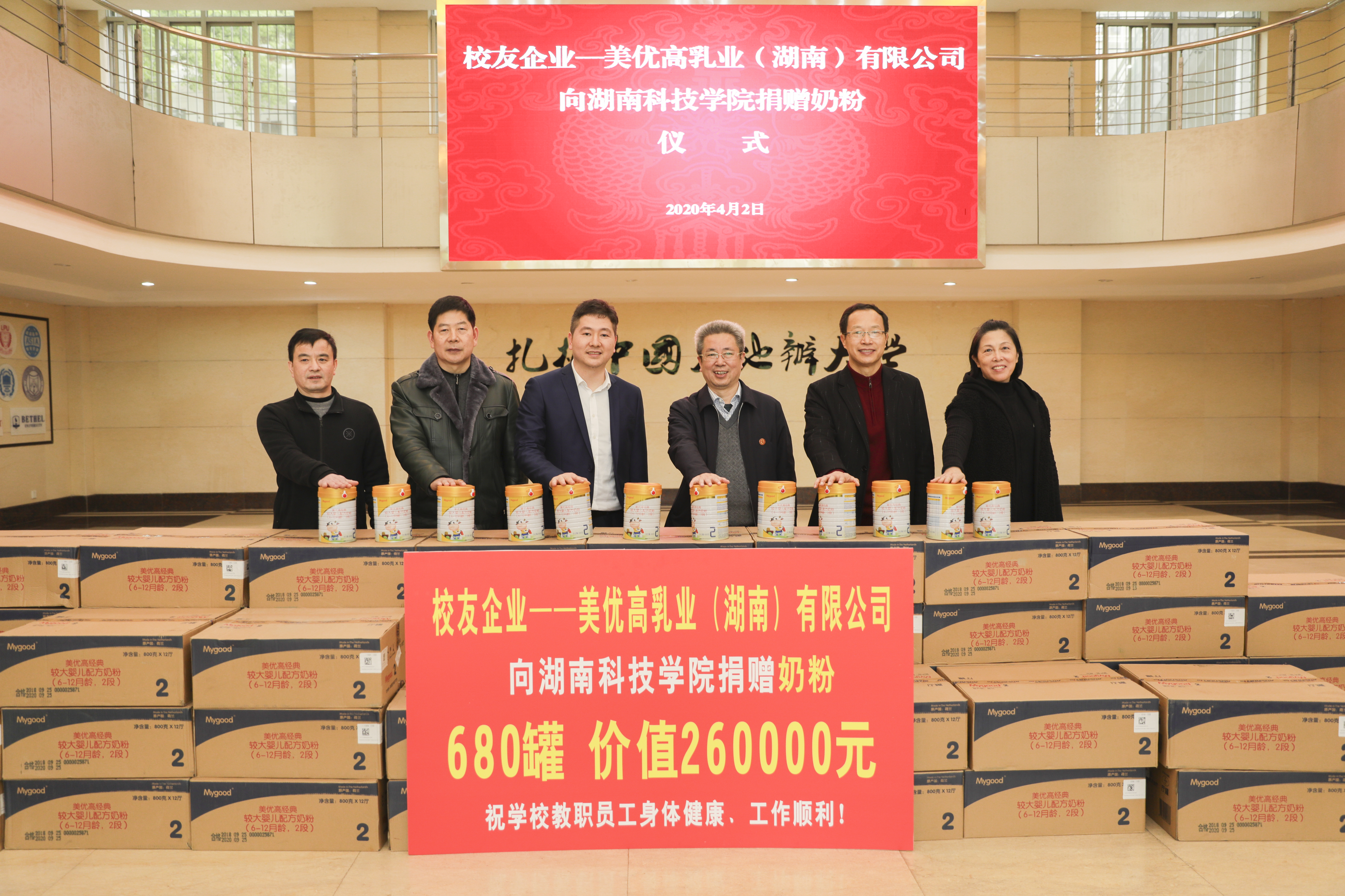 本网讯 4月2日下午,学校收到一份来自校友的沉甸甸的礼物。经济与管理学院2002级校友、美优高乳业(湖南)有限公司总经理肖明海向母校捐赠价值260000元的婴幼儿食品。爱心物品由外国语学院2002级校友何洲代捐。校党委书记曾宝成出席捐赠仪式。