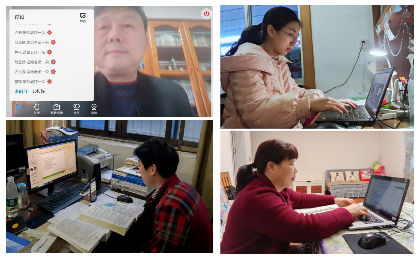 电脑屏幕内外,老师们情绪饱满、循循善诱,同学们求知若渴、充满期待。“第一次坐在家里迎接新学期!”这让外国语学院李媛又兴奋又期待,“在胡维老师的《综合英语》课上,我们学习了‘战疫期间,温暖又充满力量的15句话’,在双语世界里让我们更加坚定地与病毒奋战到底,我们青年学生应该以‘最美逆行者’为榜样,勇于担当,牢记使命,努力将书本的知识转化为自己的真本领、真才学,把个人理想追求融入实现中国梦的进程中。”