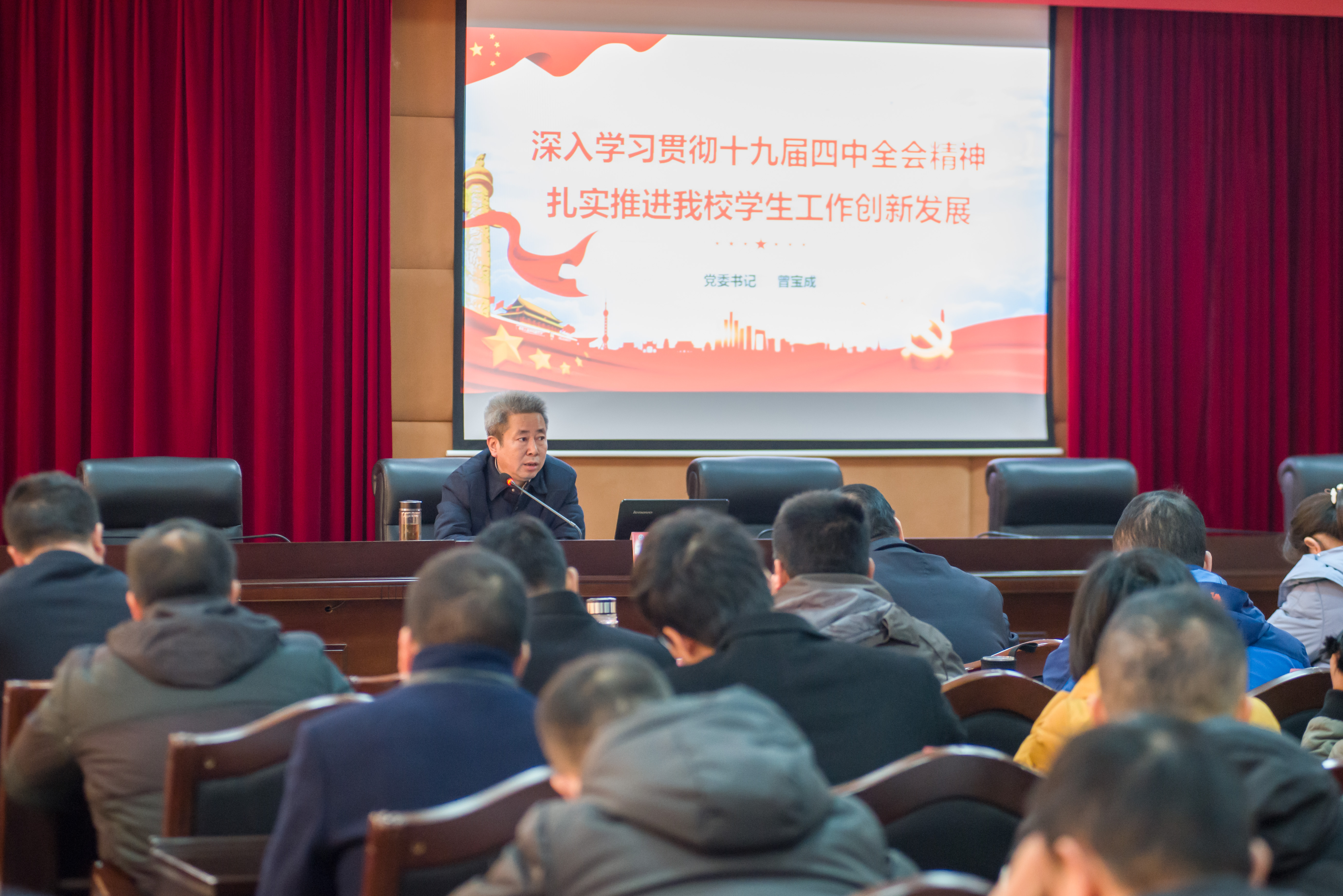 校党委书记曾宝成以《深入学习贯彻十九届四中全会精神,扎实推进世界杯官网学生工作创新发展》为题作培训第一讲。他从十九届四中全会的重大意义、基本内容、十三个方面“显著优势”、总体目标、十三个坚持和完善以及重大战略任务六个部分入手,与全体学工队伍一起系统而深刻地学习了十九届四中全会精神。他指出,落实立德树人根本任务,必须抓住理想信念铸魂这个关键、构建多方协同的育人格局、创新学生工作的方式方法、提升学生工作的科学化水平、营造浓厚的校园文化氛围、发挥党组织的战斗堡垒作用和共产党员先锋模范作用。