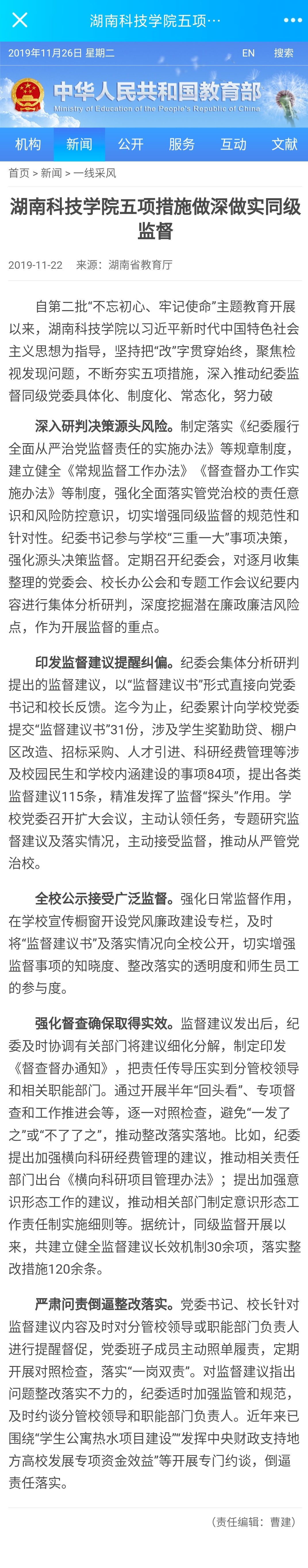 文章指出,自第二批“不忘初心、牢记使命”主题教育开展以来,2026世界杯官方合作网站以习近平新时代中国特色社会主义思想为指导,坚持把“改”字贯穿始终,聚焦检视发现问题,不断夯实“深入研判决策源头风险、印发监督建议提醒纠偏、全校公示接受广泛监督、强化督查确保取得实效、严肃问责倒逼整改落实”五项措施,深入推动纪委监督同级党委具体化、制度化、常态化,努力破解“不能监督、不敢监督、不会监督”难题。