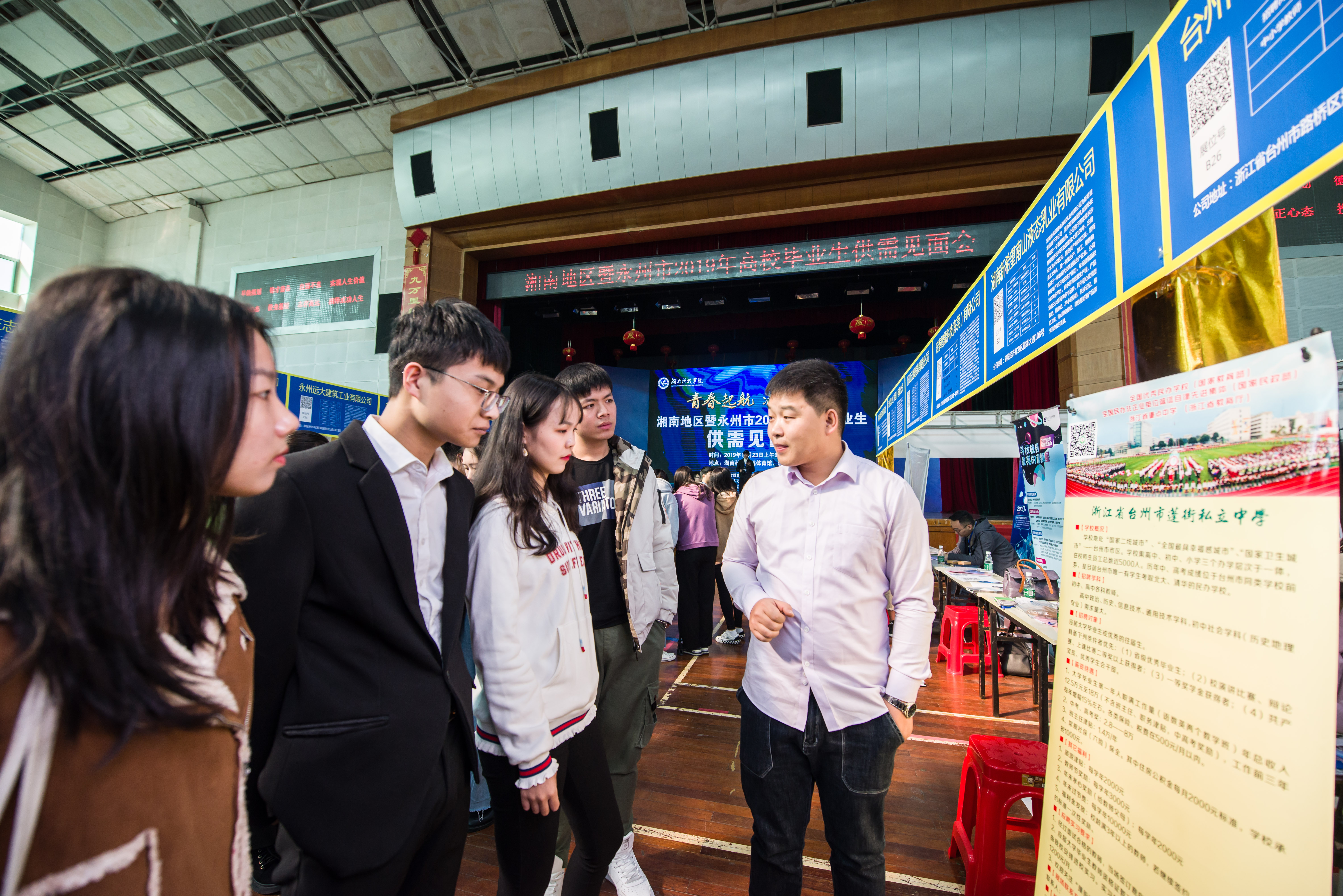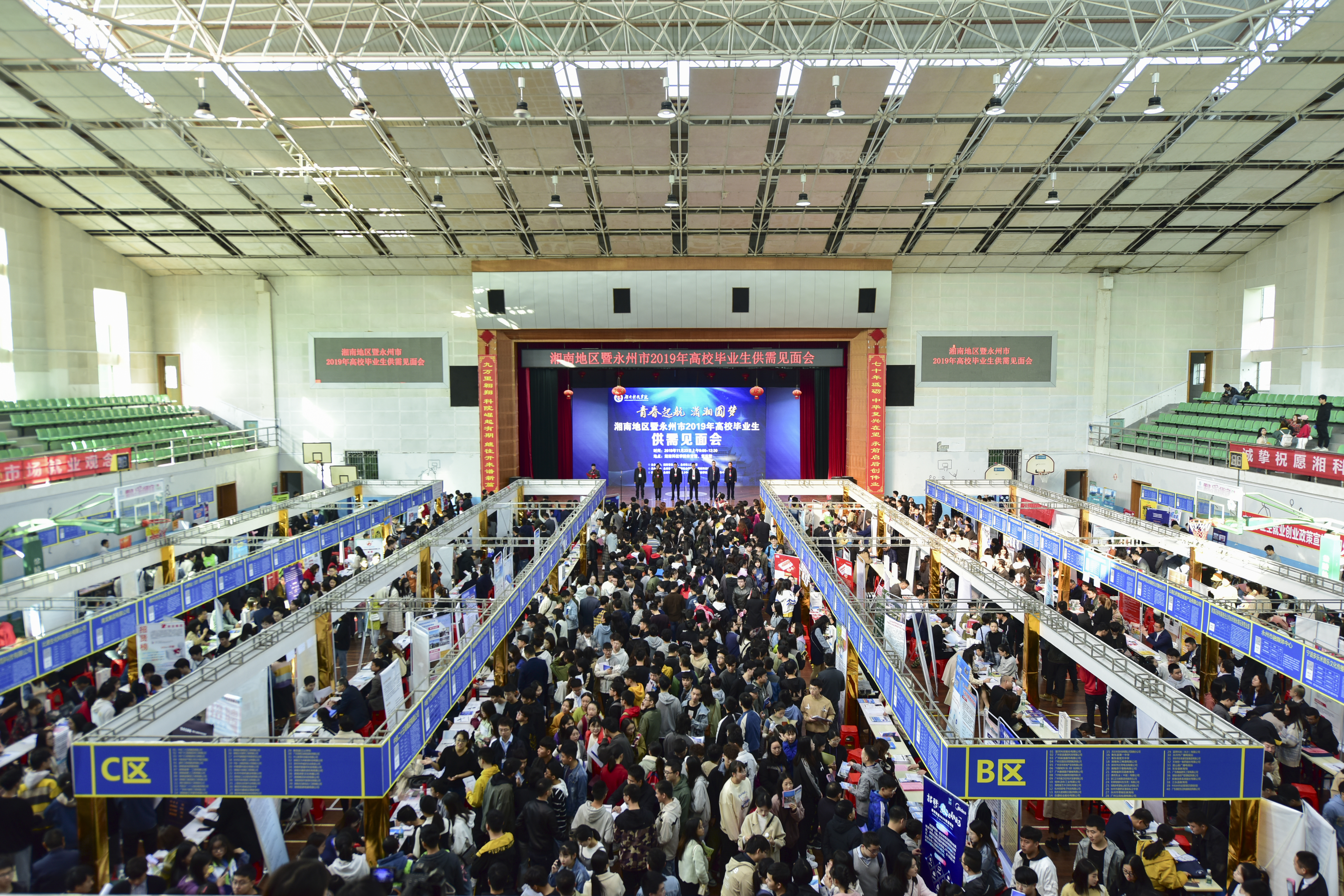 本网讯 11月23日,由湖南省教育厅、永州市人民政府主办,世界杯官网和永州市人力资源和社会保障局共同承办的“青春启航,潇湘圆梦”湘南地区暨永州市2019年高校毕业生供需见面会在校举行,吸引了来自校内外的应届毕业生8300人次进场求职。