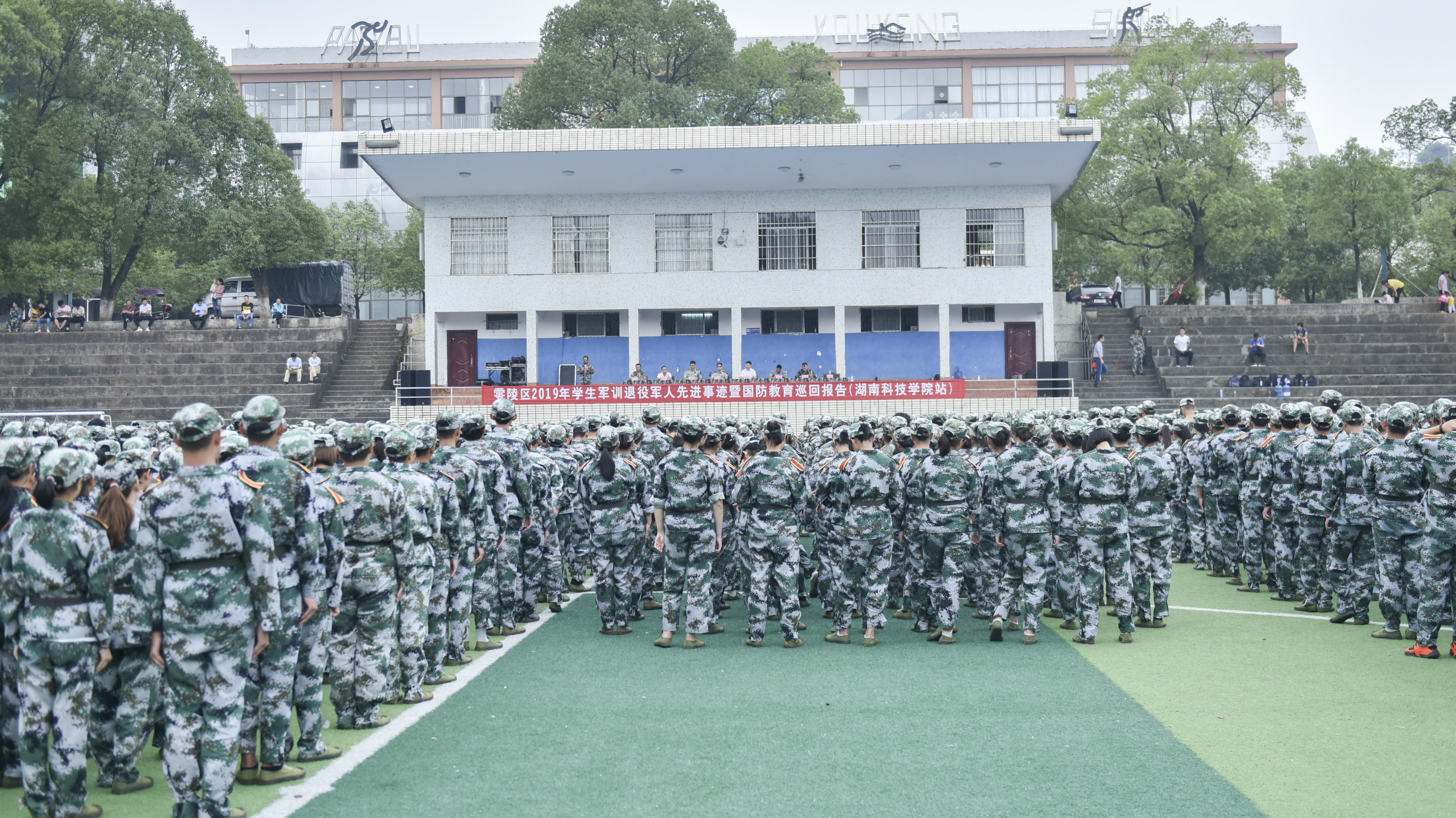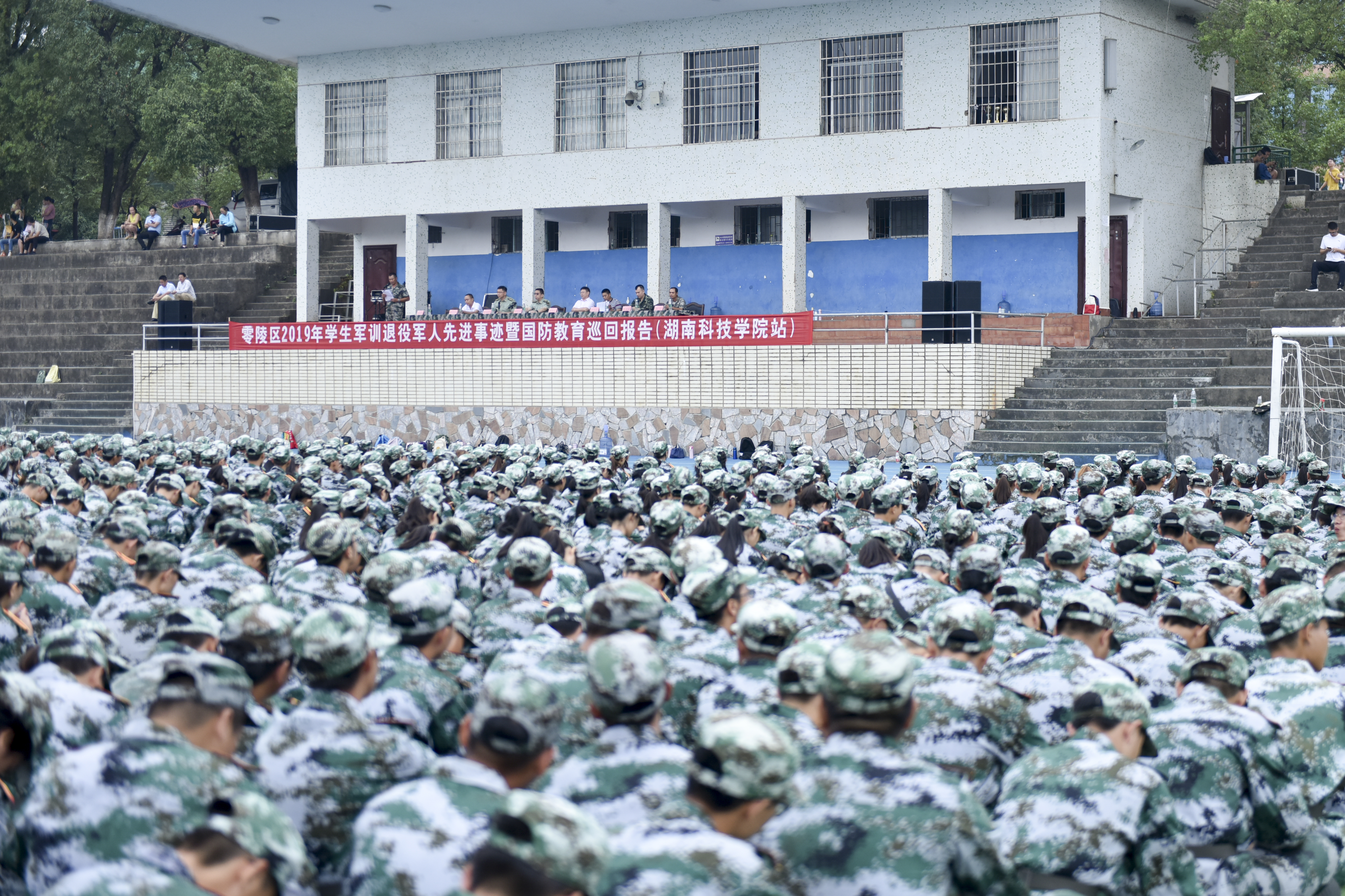 本网讯 9月17日上午,零陵区2019年学生军训退役军人先进事迹暨国防教育巡回报告在学校举行,世界杯官网2019级4000余名新生参与活动,在紧张的军训间隙接受了一堂深刻的国防教育课,感受报国情,共筑国防梦。