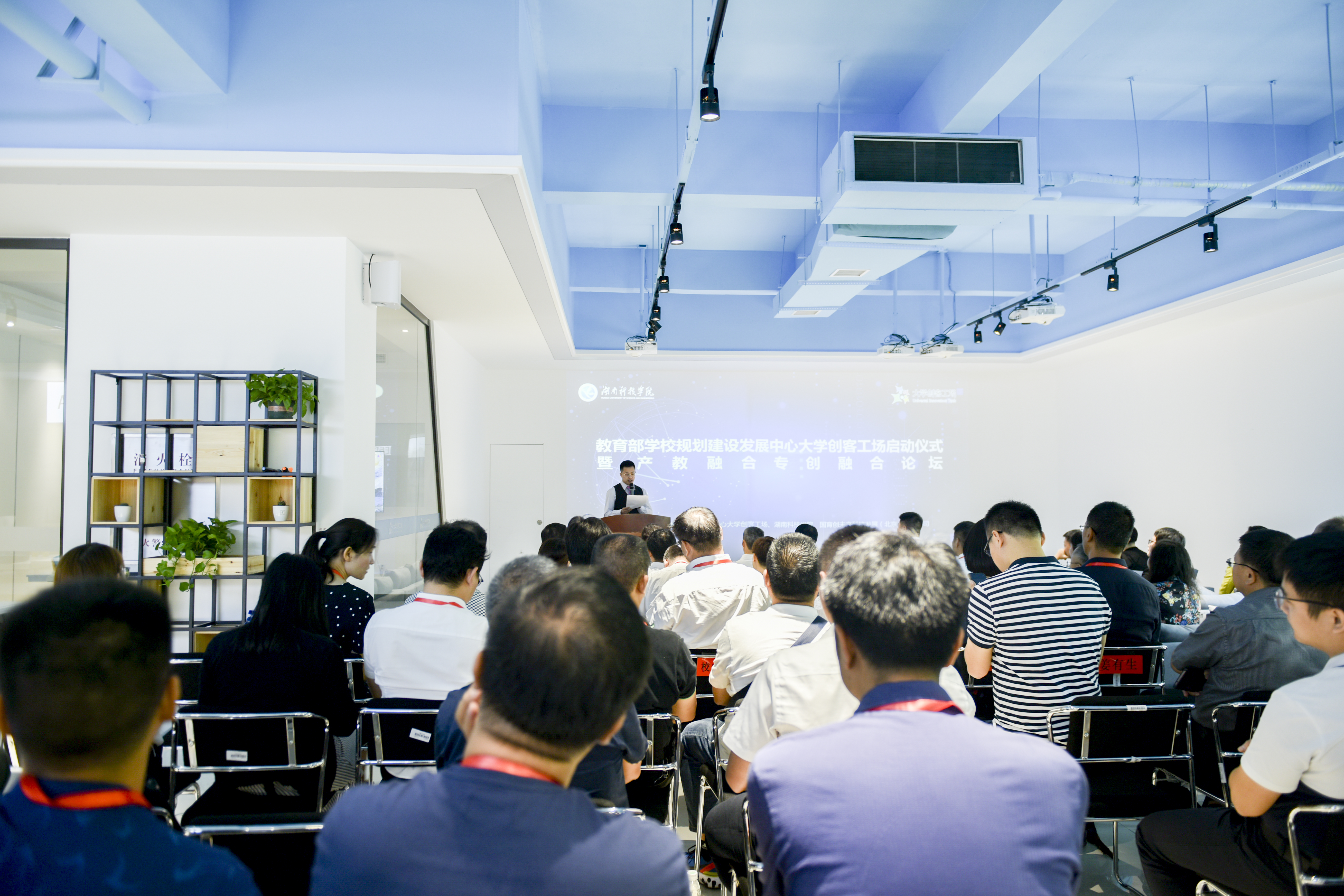 本网讯 9月21日上午,教育部学校规划建设发展中心首家大学创客工场启动仪式暨产教融合专创融合论坛在学校举行。湖南省大中专学校学生信息咨询与就业指导中心副主任夏学军,湖南省科技厅高新处副处长彭子晟,教育部学校规划建设发展中心大学创客工场执行总经理马卉子,中国经济文化交流协会艺术与设计专业委员会副理事长施洁予,副校长李常健,程智开以及同济大学、湖南农业大学等19所省内外高校的专家学者,学校创新创业学院院务委员会成员、教学学院党总支书记以及部分学生代表参加了启动仪式及论坛。