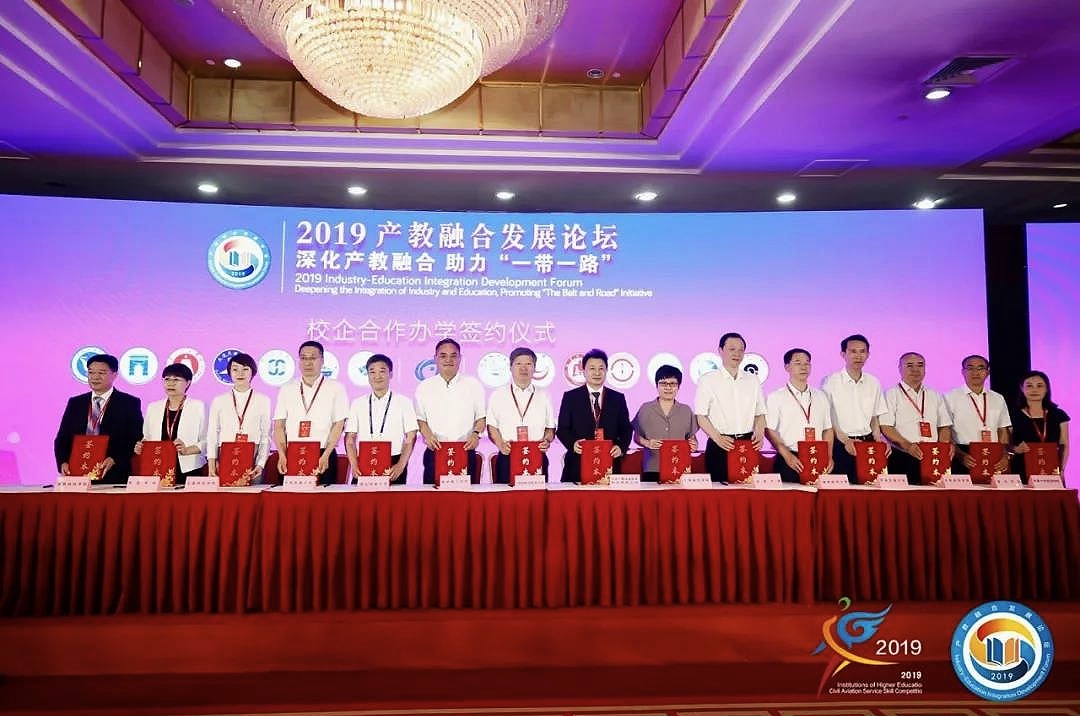 本网讯 7月19日,由中国高等教育学会指导,中国高等教育学会产教融合研究分会、中国教育电视台主办,中国教育报、中国民航报等协办,北京广慧金通教育科技有限公司承办的“深化产教融合 助力‘一带一路’”2019产教融合发展论坛在河北廊坊召开,来自教育界、国家民委、民航系统、全国400余所高校党委书记、校长等领导,海外40余位国家大学校长和驻华使节,以及200余家航空公司、机场集团、企事业单位领导和嘉宾共计700余人齐聚一堂,共商新时代产教融合发展。世界杯官网副校长宋宏福带领教务处、传媒学院、旅游与文化产业学院等部门和学院负责人参加,并代表学校与北京广慧金通教育科技有限公司签订校企合作协议。