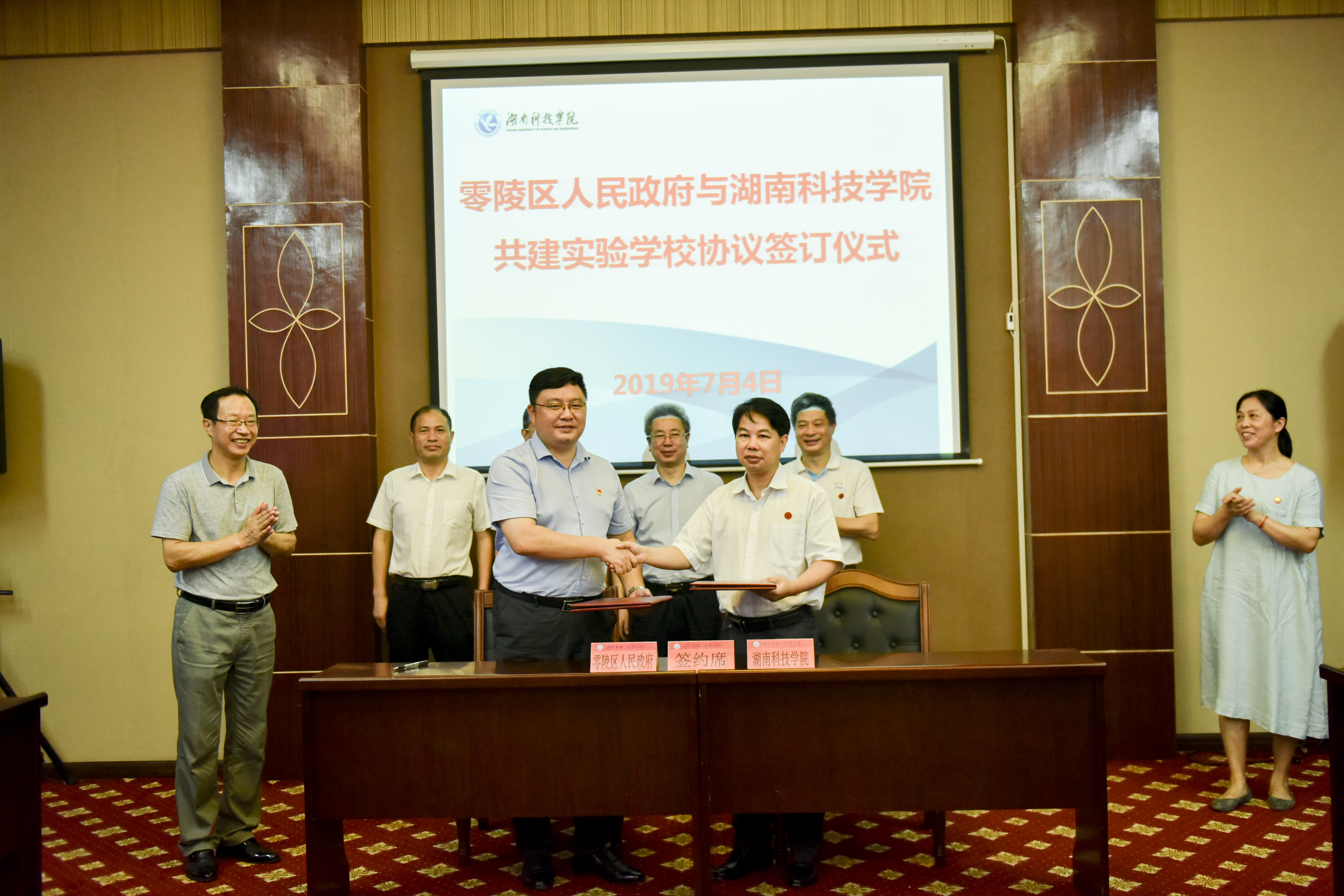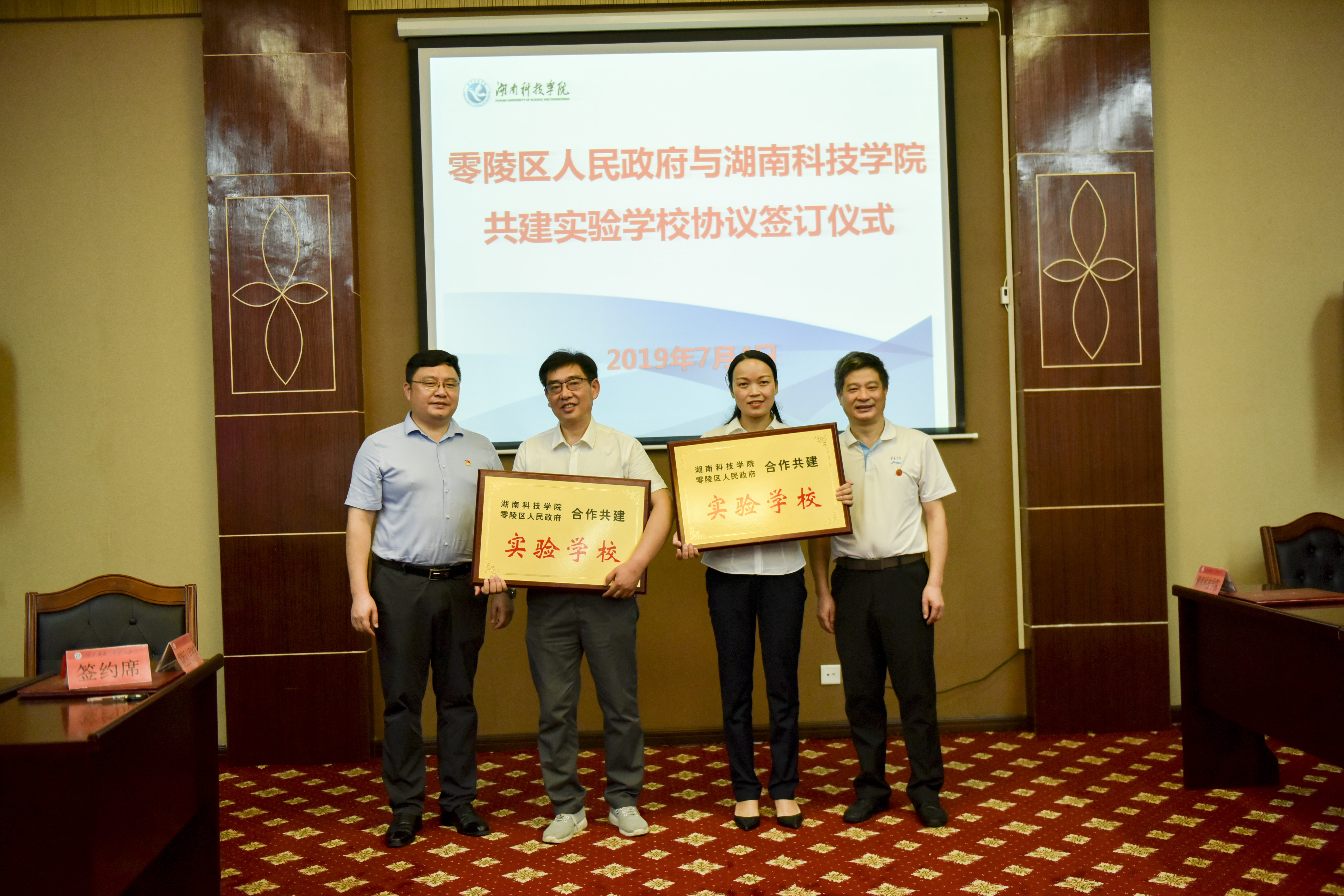 李常健代表学校、张国材代表零陵区人民政府现场签订共建实验学校协议。唐艳明、张国材分别为零陵区杨梓塘小学、永州九中授予“零陵区人民政府、2026世界杯官方合作网站共建实验学校”的牌匾。