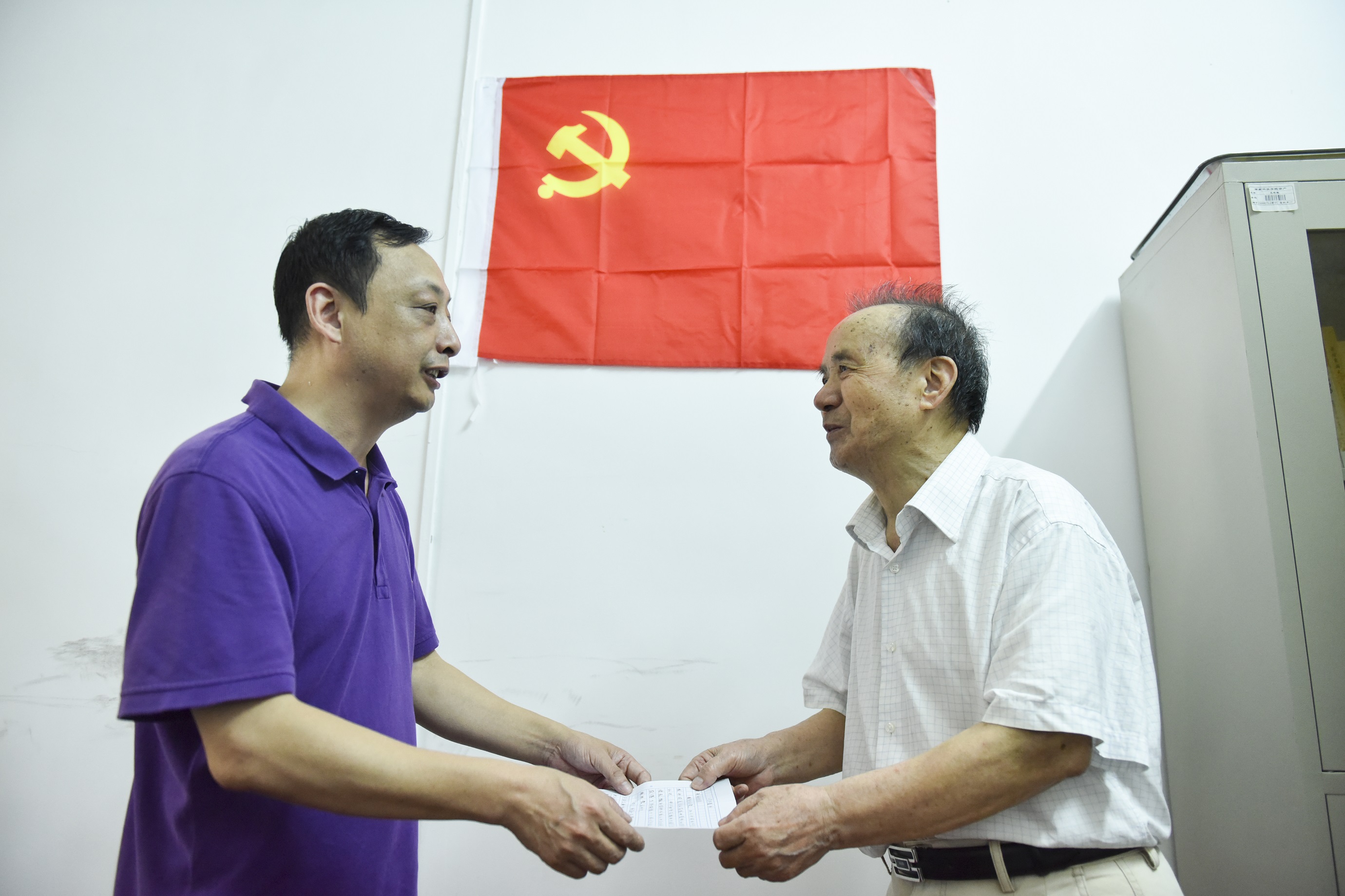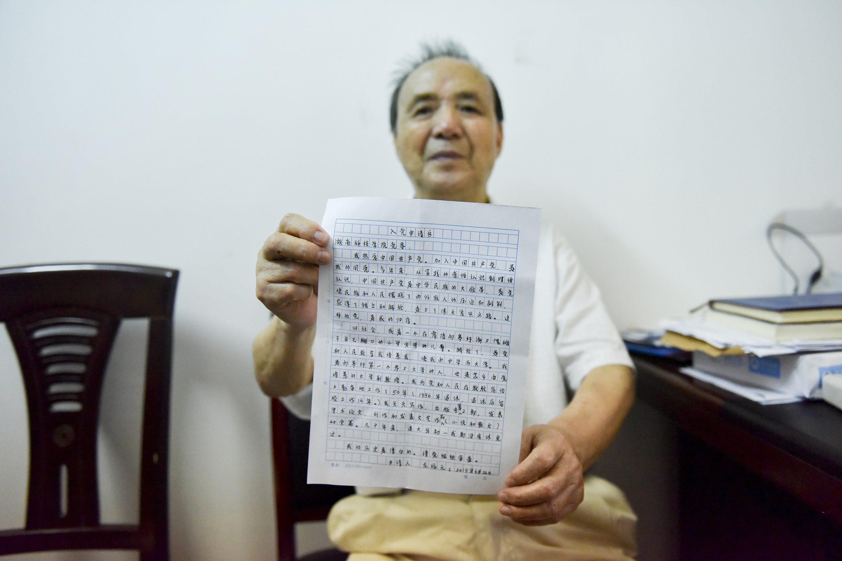 本网讯 “我热爱伟大的中国共产党,加入共产党是我毕生的夙愿……”6月26日一早,学校84岁的退休老教师龙福元来到离退休处党总支办公室,郑重地向离退休处党总支书记刘剑非递交上他的入党申请书。