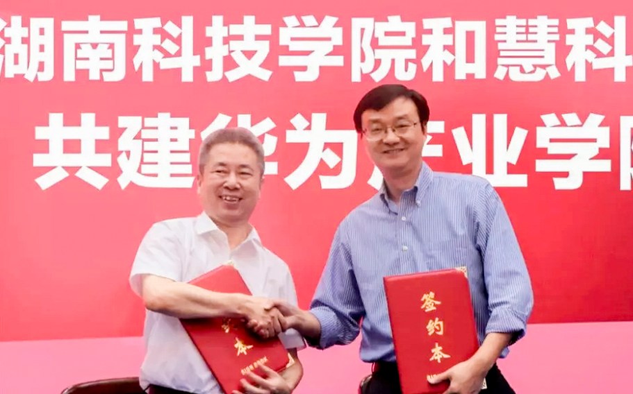 研讨会上, 曾宝成与慧科集团总裁王浩共同签定开展深度校企合作协议,共建“华为产业学院”,共同培养大数据、物联网、人工智能等新兴技术人才。双方共建的华为产业学院将于今年9月迎来首届大数据专业新生,这也将是湖南省本科院校的第一批真正意义上的产教融合联合培养的新工科专业学生。