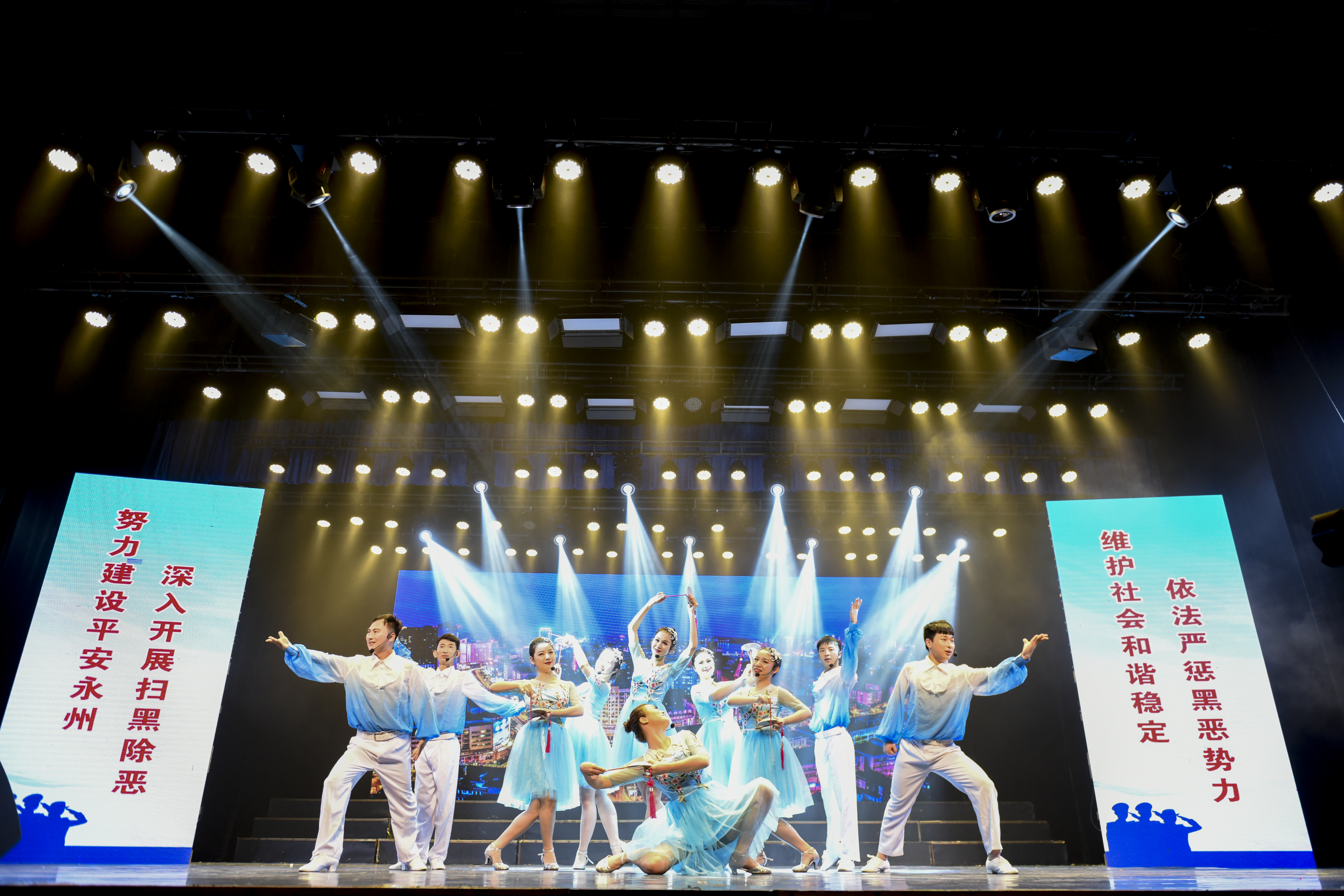 大气磅礴的舞蹈、气势恢宏的演出、奋战一线的勇敢精神、不惧危险的英雄本色,开场舞《利剑》为观众演绎了扫黑除恶的“速度与激情”。歌曲《扫黑除恶之歌》与《扫黑除恶 造福人民》充分展现了永州公安在扫黑除恶一线惩恶扬善、不畏强权、除暴安民的英勇斗志和构筑长治久安的坚强决心。
