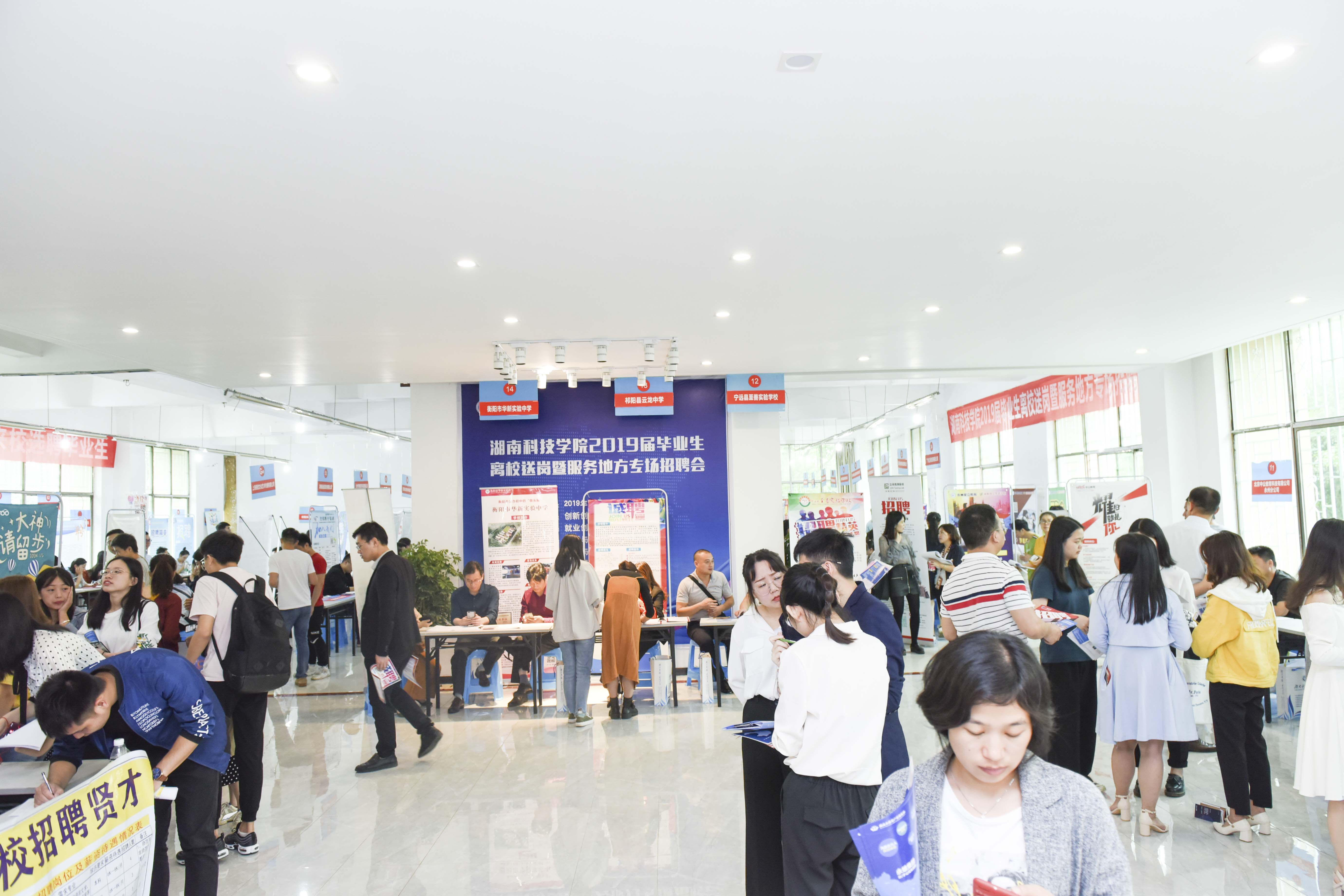 本网讯 5月21日,学校举办2019届毕业生离校送岗暨服务地方专场招聘会。此次招聘会共吸引省内外96家用人单位参会,其中永州企业25家,提供就业岗位2100余个,党委书记、校长曾宝成来到现场与用人单位和毕业生进行交流。