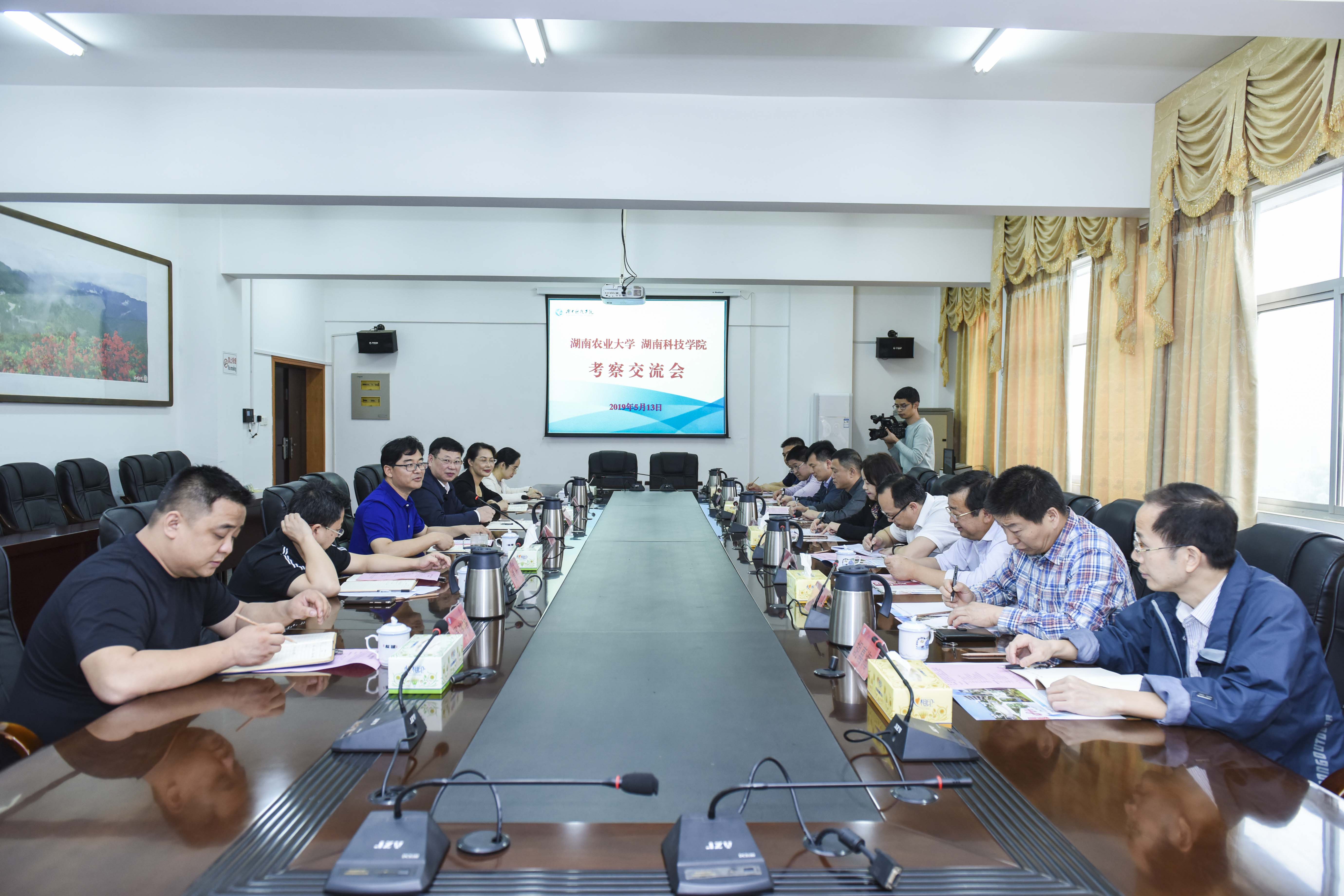 本网讯 5月13日下午,湖南农业大学党委委员、副校长张立一行9人来世界杯官网进行考察交流,纪委书记彭立威,党政办、教务处、学工部、保卫处、就业创业指导中心等相关职能部门负责人参加交流座谈。