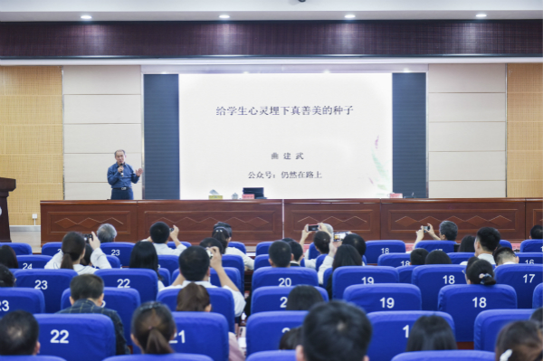 曲建武说:“有了学生就有了幸福。”2013年,他辞官从教,继续回去当辅导员,整整37年,他没有一天离开过学生工作。现场的师生们不仅被他“心系学生”的教育情怀所感动,更被他身体力行、行胜于言的实践理念和精神所折服。曲建武情真意切的演讲引起台下老师们的强烈共鸣,不时爆发出热烈的掌声。