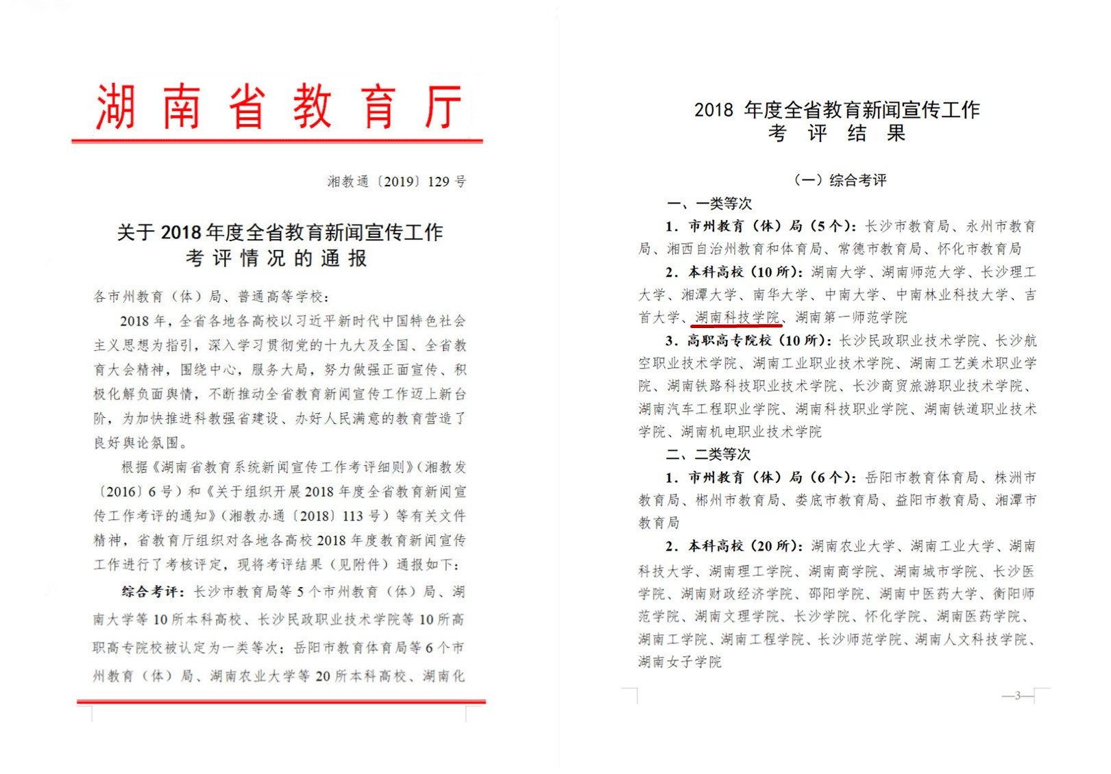 本网讯 近日,湖南省教育厅下发《关于2018年度全省教育新闻宣传工作考评情况的通报》,世界杯官网在2018年度全省教育新闻宣传工作综合考评中获评一类等次(优秀),这是世界杯官网第四次获此殊荣。