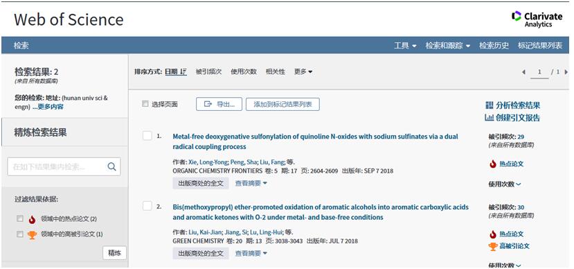 刘开建博士2018年7月发表在《Green Chemistry》(IF= 8.586)期刊、题名为“Bis(methoxypropyl) ether-promoted oxidation of aromatic alcohols into aromatic carboxylic acids and aromatic ketones with O2 under metal- and base-free conditions”的论文同时入选本期化学学科ESI热点论文和高被引论文(图2)。数据显示2017-2018年中ESI收录《Green Chemistry》的1193篇论文中,有26篇论文入选ESI高被引论文,2篇论文入选ESI热点论文(图3)。