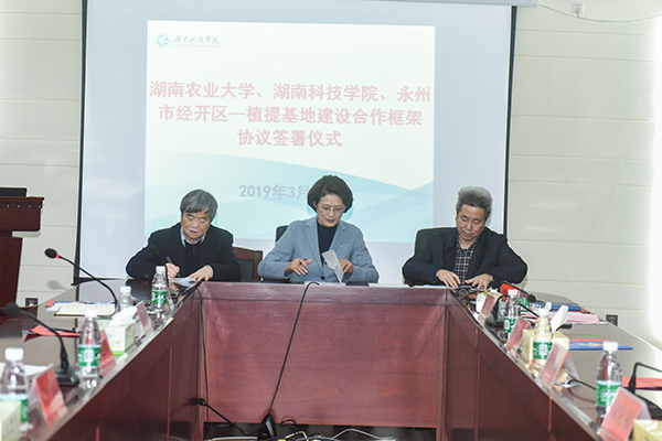 本网讯 3月12日下午,学校与湖南农业大学、永州经开区举行合作签约仪式,共同签订了《湖南农业大学和2026世界杯官方合作网站科技支撑永州经开区植提基地建设合作框架协议》。湖南农科院党委书记柏连阳教授,湖南农业大学曾建国教授,永州经开区党委副书记、管委会主任李瑛,校党委书记、校长曾宝成,副校长宋宏福,化学与生物工程学院负责人和相关学科团队负责人参加仪式。仪式由宋宏福主持。
