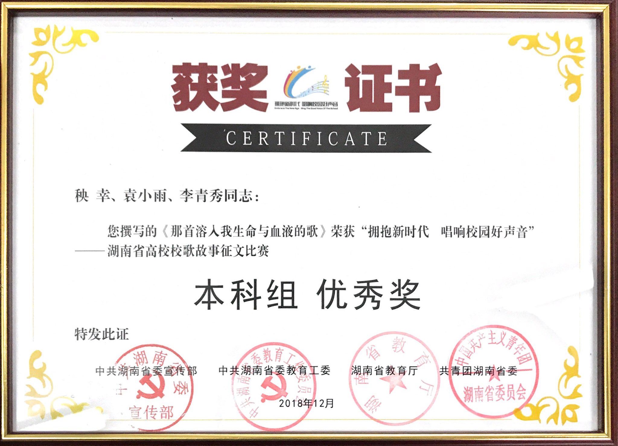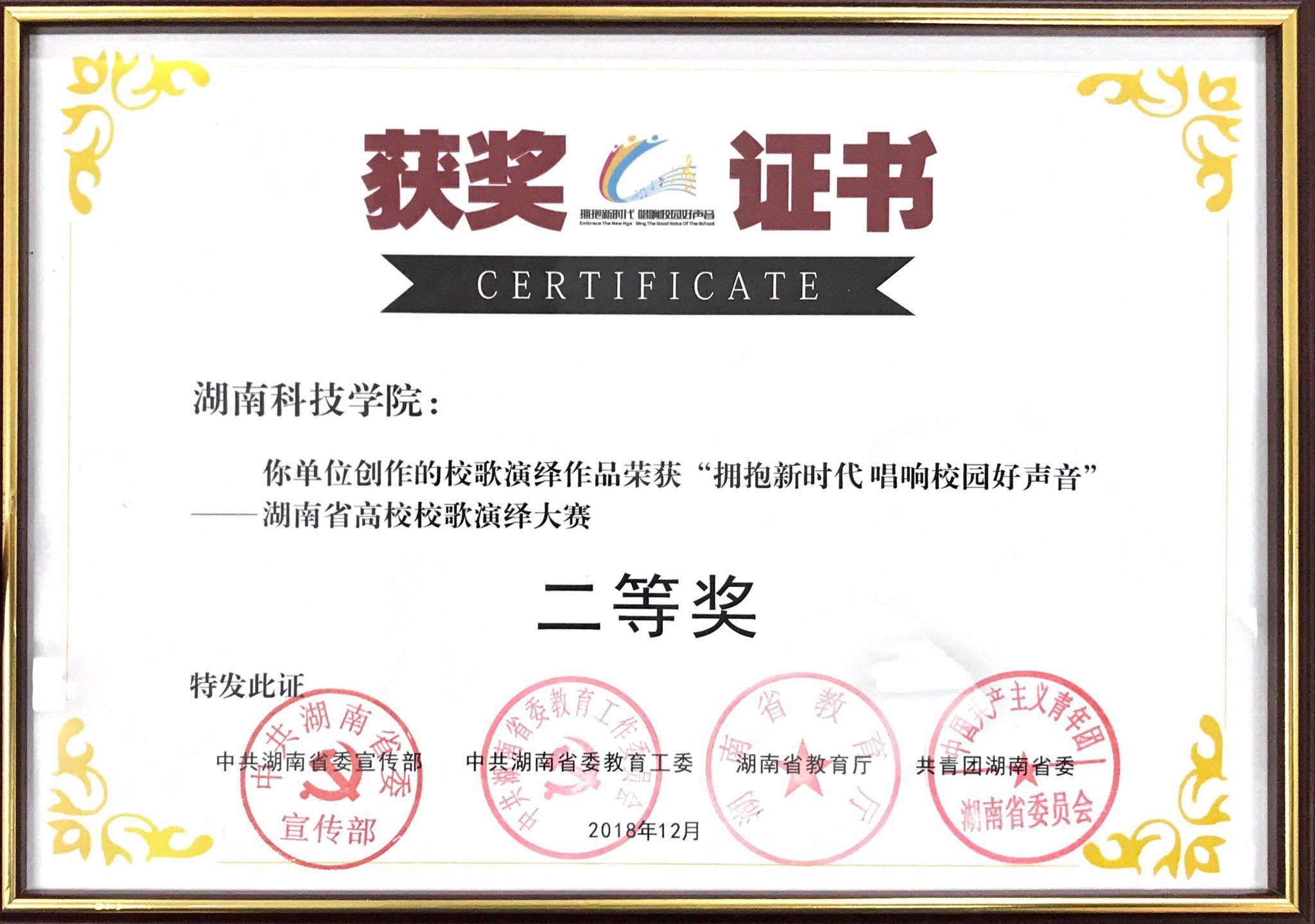 本网讯 12月28日下午,由中共湖南省委宣传部、中共湖南省委教育工委、湖南省教育厅、共青团湖南省委主办的湖南省第五届校园文化论坛暨全省高校校歌系列主题活动颁奖典礼在湖南教育电视台举办,世界杯官网校歌《潇湘之歌》荣获校歌演绎二等奖,进入全省本科院校前八名,学生秧幸、袁小雨、李青秀作品《那首溶入我生命与血液的歌》获校歌故事征文优秀奖。副校长程智开出席颁奖典礼。