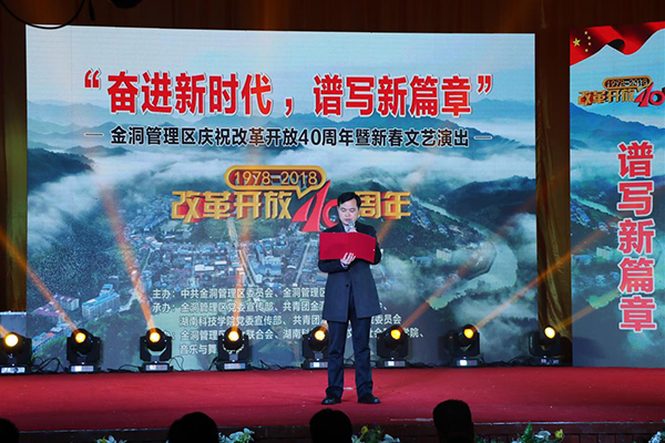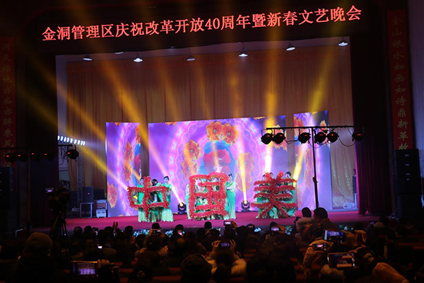本网讯 1月3日,“奋进新时代,谱写新篇章——金洞管理区庆祝改革开放40周年暨新春文艺晚会”在金洞大会堂举行。活动由金洞管理区党委、管委会主办,由世界杯官网党委宣传部、团委和金洞管理区党委宣传部、团区委承办,世界杯官网人文与社会科学学院、音乐与舞蹈学院和金洞管理区妇联协办。学校副校长程智开,党委委员、宣传部长杨涛等到会观看演出。