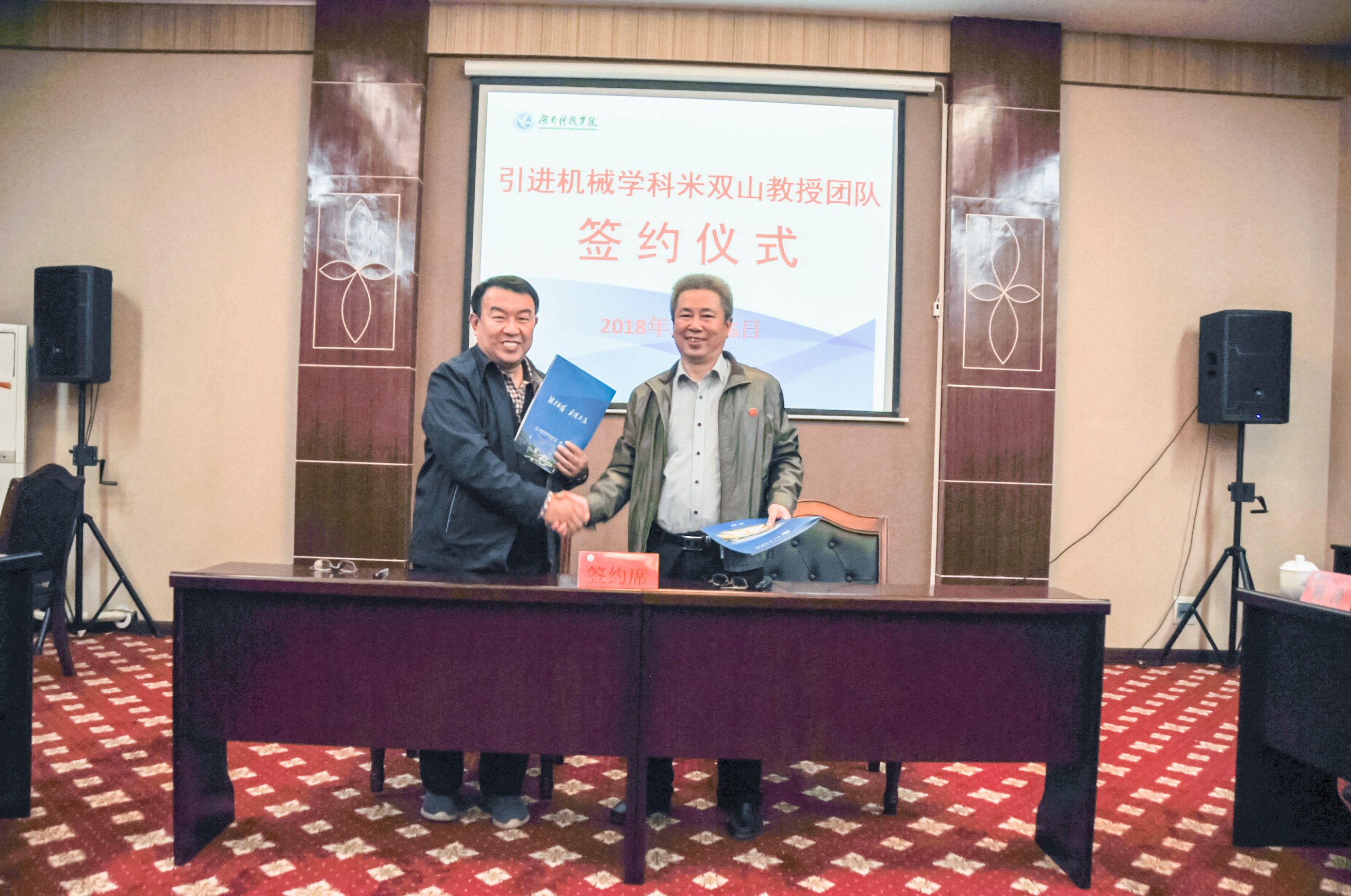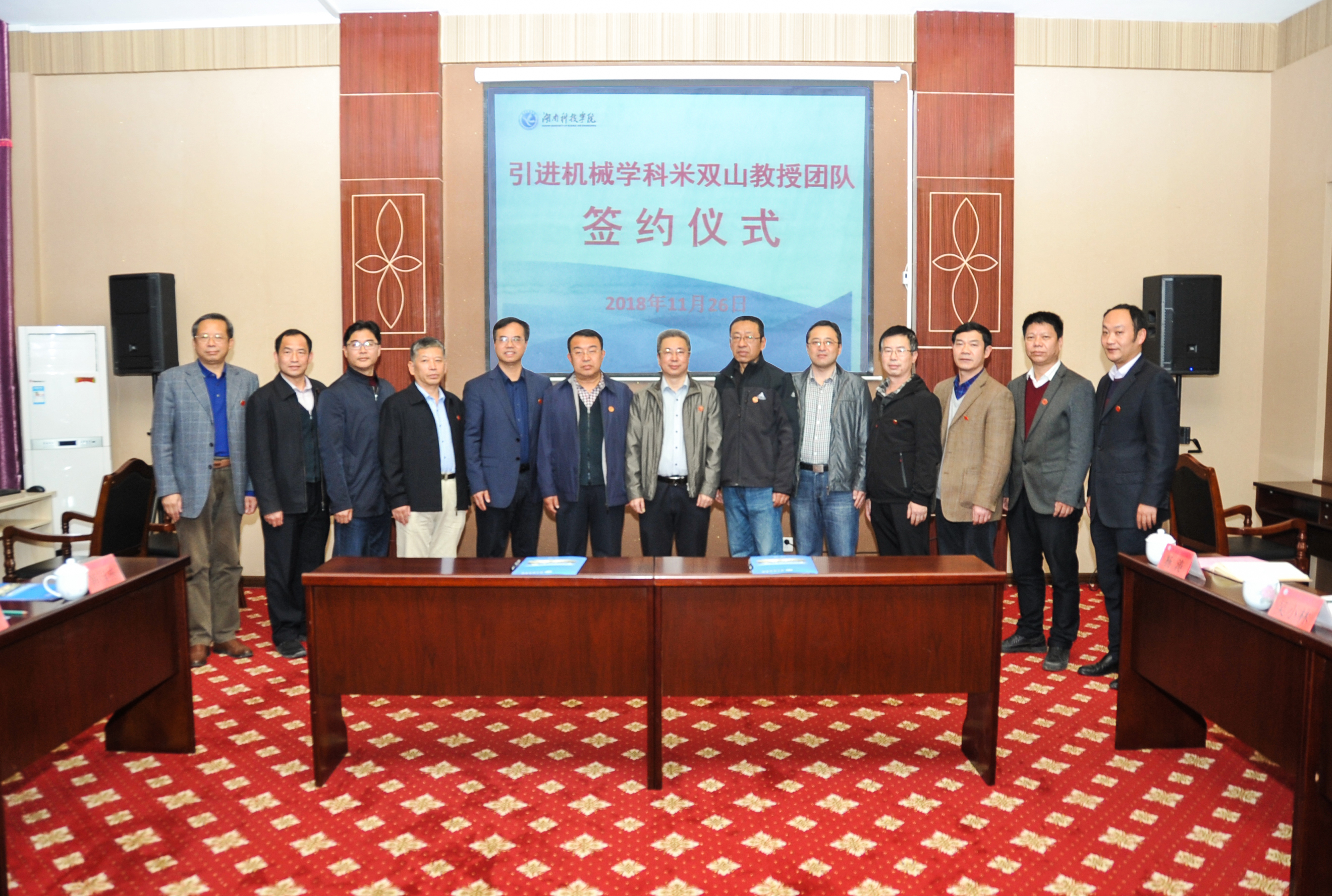 纪委书记彭立威主持仪式。校长曾宝成与团队带头人米双山教授签约,学生代表向团队全体成员献花并佩戴校徽,现场响起长时间热烈的掌声。