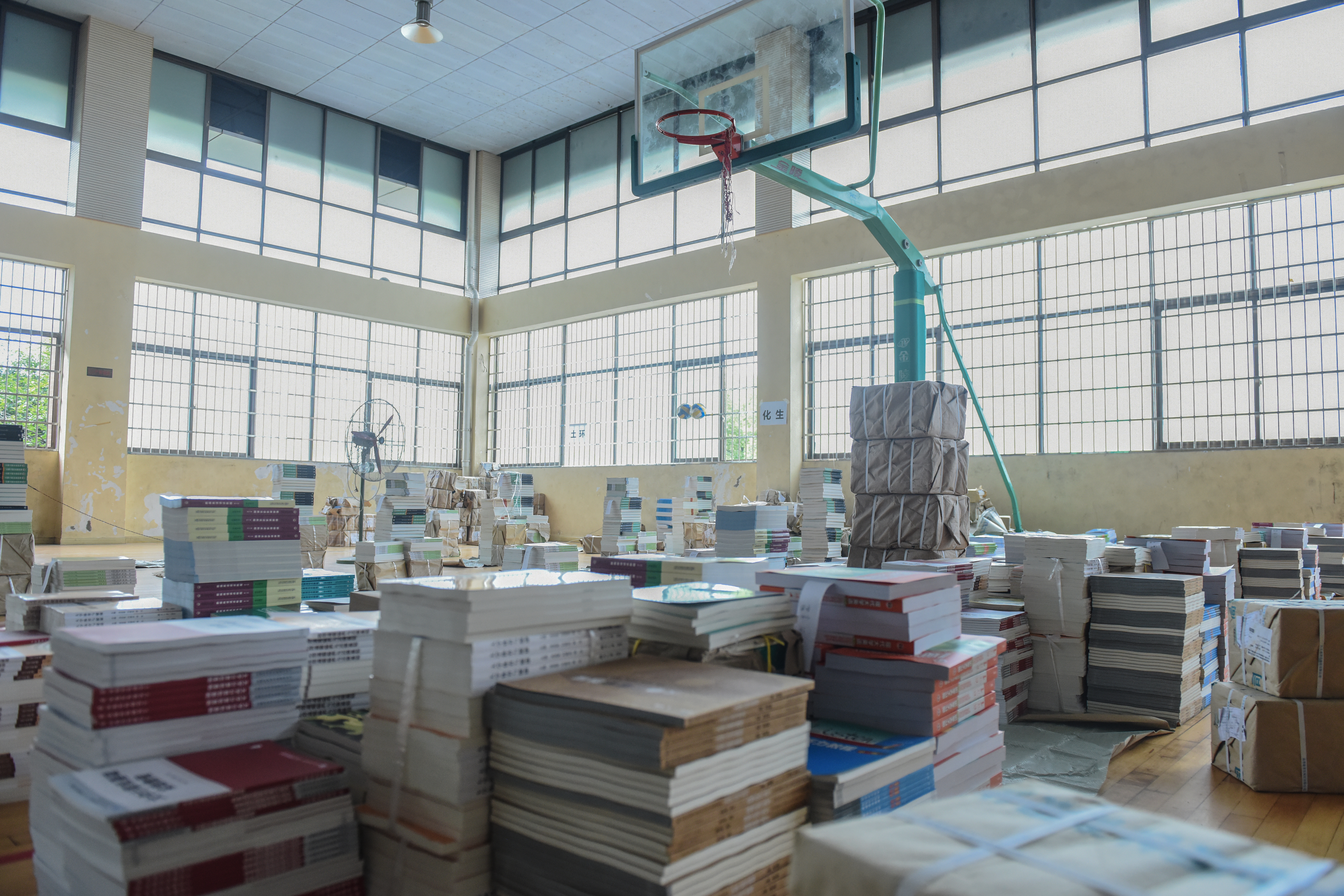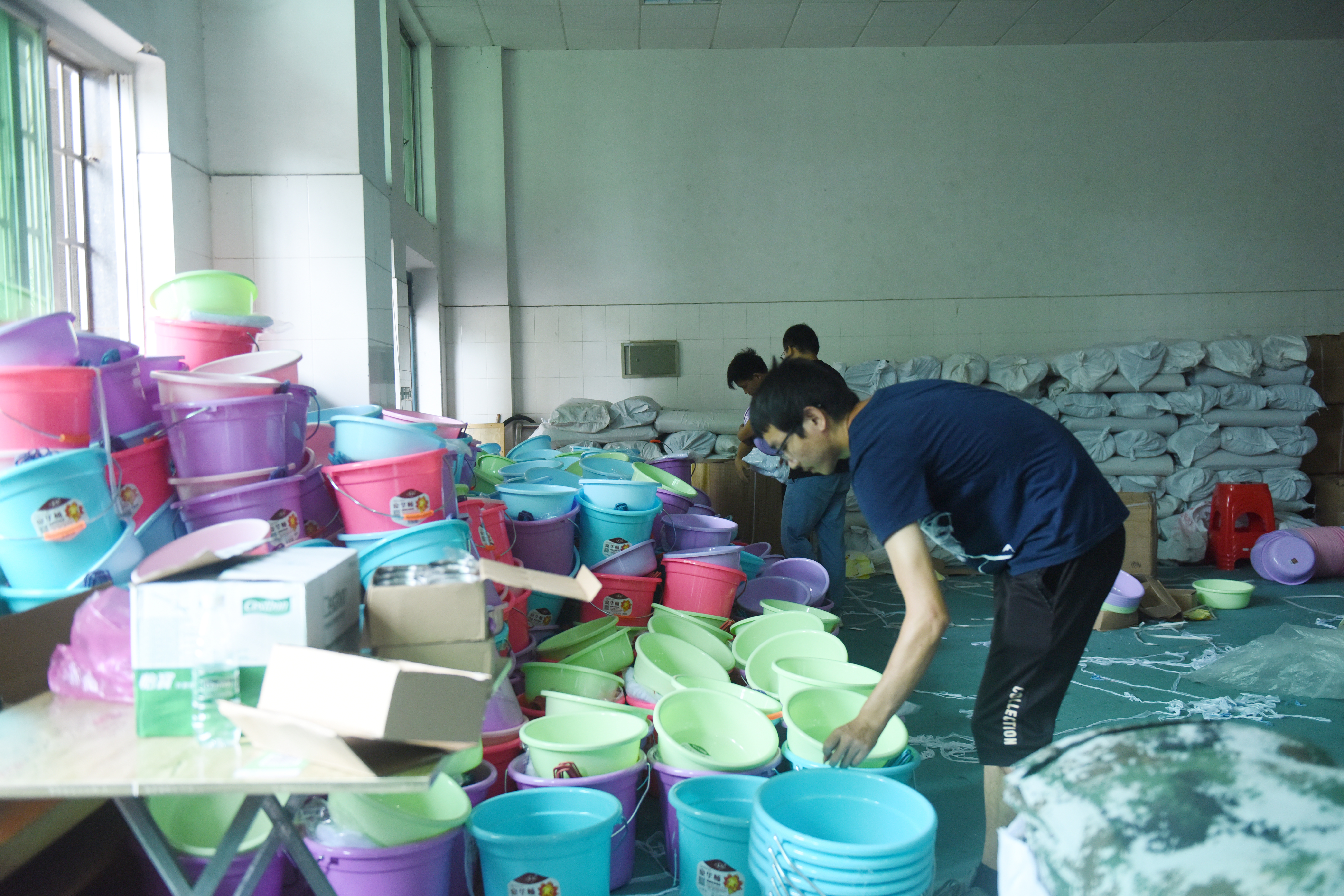 在学校体育馆东侧,工作人员正在整理生活用品