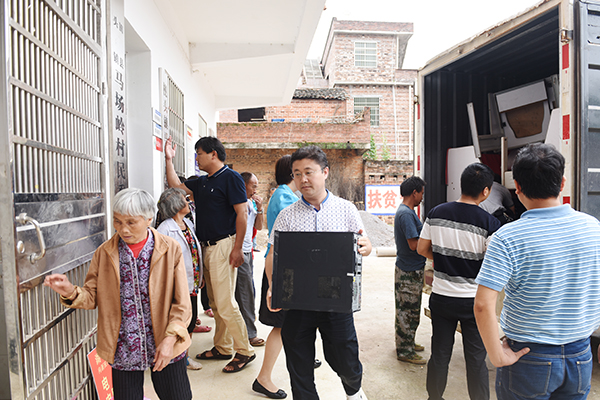 本网讯 6月14日上午,校长曾宝成及校领导唐艳明、郑山明、吴小林带领学校中层干部赴新田县枧头镇马场岭村开展“结对子认亲戚”暨电子阅览室捐建活动,向该村捐赠了20台电脑及电脑桌,总价值八万元,并与该村签订了捐建电子阅览室协议书。
