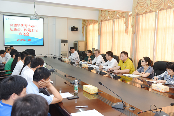 本网讯 6月8日上午,学校召开2018届优秀毕业生赴新疆、西藏工作欢送会。校长曾宝成、副校长程智开与即将奔赴新疆、西藏工作的2018届优秀毕业生交流畅谈,送上了诚挚的祝福和嘱托。