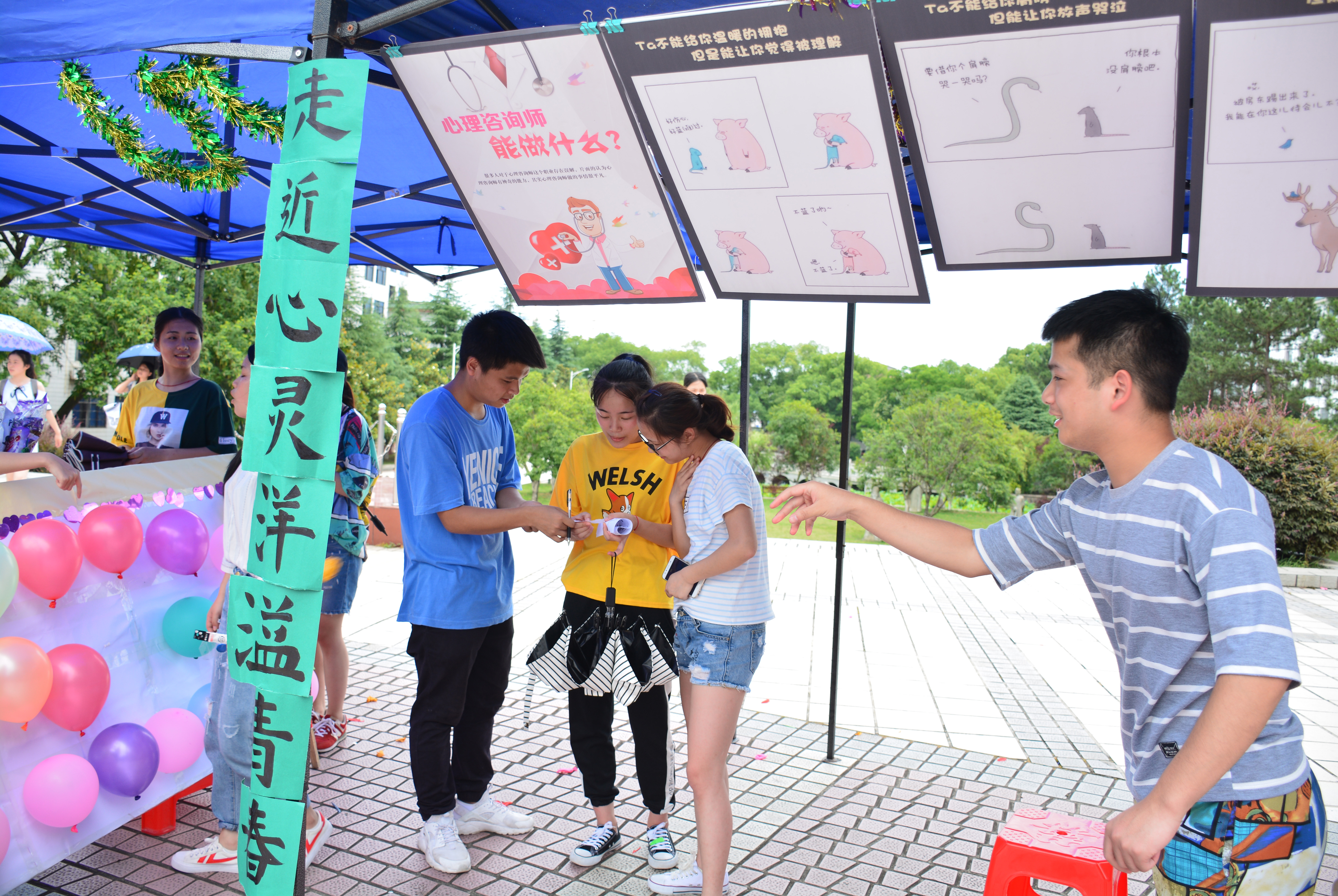 活动主要分为心理知识展示和心理体验活动。现场,通过展板、喷绘、心理期刊、心灵书签等丰富多样的载体,介绍常见心理问题症状和调节策略,宣传心理健康知识,展示心理活动成果。此外,你画我猜、珠行万里、不一样的绘画、心灵默契相约、记忆考验等活动,吸引了来自全校各个学院的师生参与。