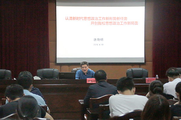 唐艳明以“认清新时代思想政治工作新形势新任务,开创世界杯官网思想政治工作新局面”为主题,紧紧围绕党的十九大报告和习近平总书记在全国高校思想政治工作会议上的重要讲话精神,从深刻理会新时代高校思想政治工作新精神新要求、准确把握新时代高校思想政治工作新形势新挑战、认真落实新时代高校思想政治工作新使命新任务三个方面作了精彩的辅导报告。