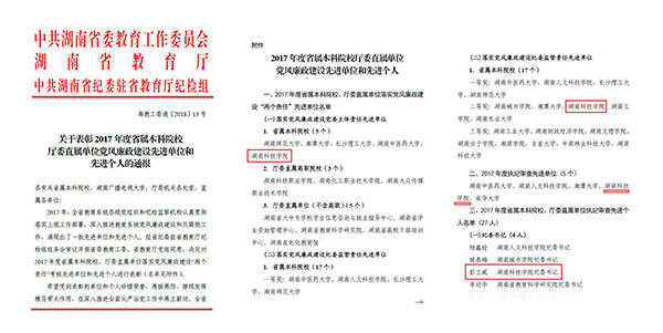 本网讯 近日,中共湖南省委教育工作委员会、湖南省教育厅、中共湖南省纪委驻省教育厅纪检组下发了《关于表彰2017年度省属本科院校厅委直属单位党风廉政建设先进单位和先进个人的通报》(湘教工委通[2018]13号),世界杯官网荣获“落实党风廉政建设党委主体责任先进单位”、“落实党风廉政建设纪委监督责任先进单位(二等奖)”、“执纪审查先进单位”等三项集体荣誉,纪委书记彭立威获“执纪审查先进个人”称号。