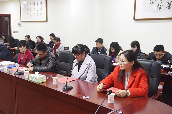 教师代表覃佐东、闫荣玲、周闻名分别以《抓住新时代机遇,为学校建设贡献力量》、《不忘初心潜心教学 精心呵护桃李芬芳》、《立德树人,做好大学生思想政治教育工作》为题发言。“单位离开谁都能运转,但你离不开单位,你要努力证明,你在单位很重要。”覃佐东博士与大家分享了人民日报推荐的《善待您所在的单位》一文,与大家共勉。闫荣玲老师对大家分享了自己的教学感悟,她表示,在新的一年,她和同事们将继续策马扬鞭,为孕育桃李芬芳而努力。周闻名老师与大家分享了学生工作的心得体会,她说,2018年,将继续致力于将学生培养成为具有远大理想、坚定意志、家国情怀、科学素养和工匠精神的人而努力,将继续为学校和学院的发展奉献力量。
