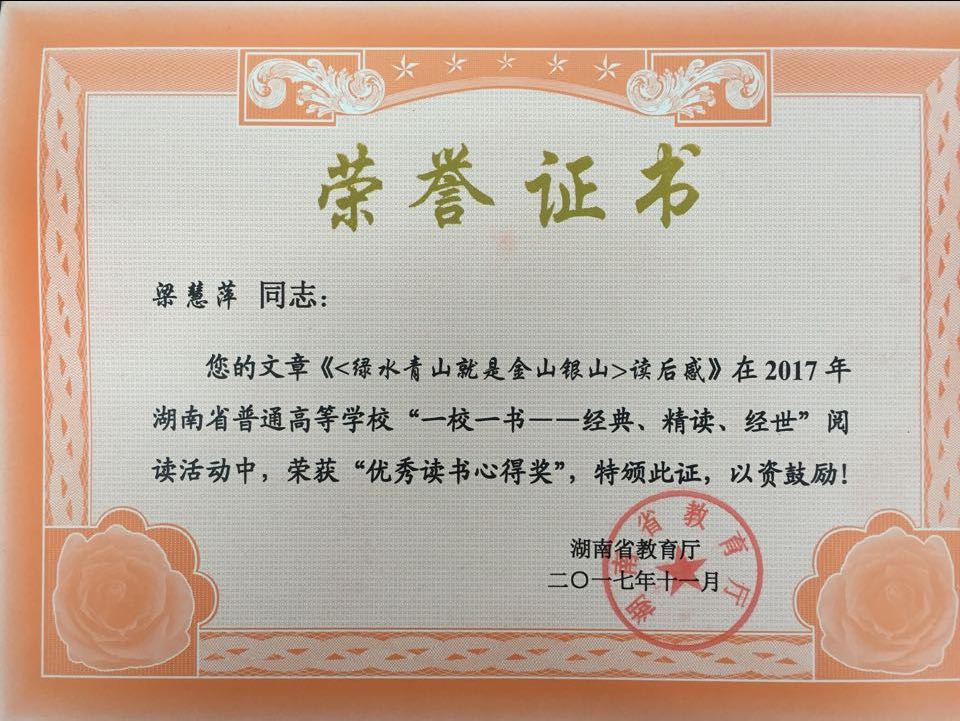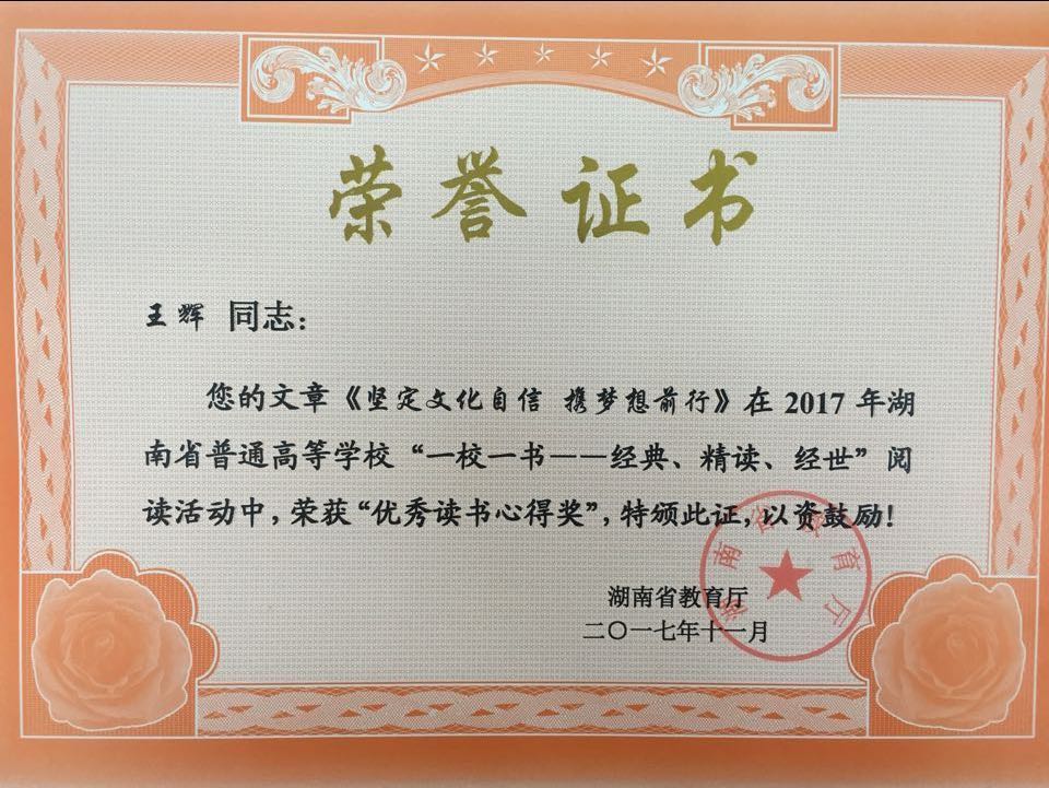 本网讯 日前,在湖南省教育厅主办的2017年全省普通高校“一校一书”阅读推广活动中,世界杯官网图书馆推送的汉文1503班王辉同学和营销1502班梁慧萍两位同学的作品喜获“优秀读书心得奖”。