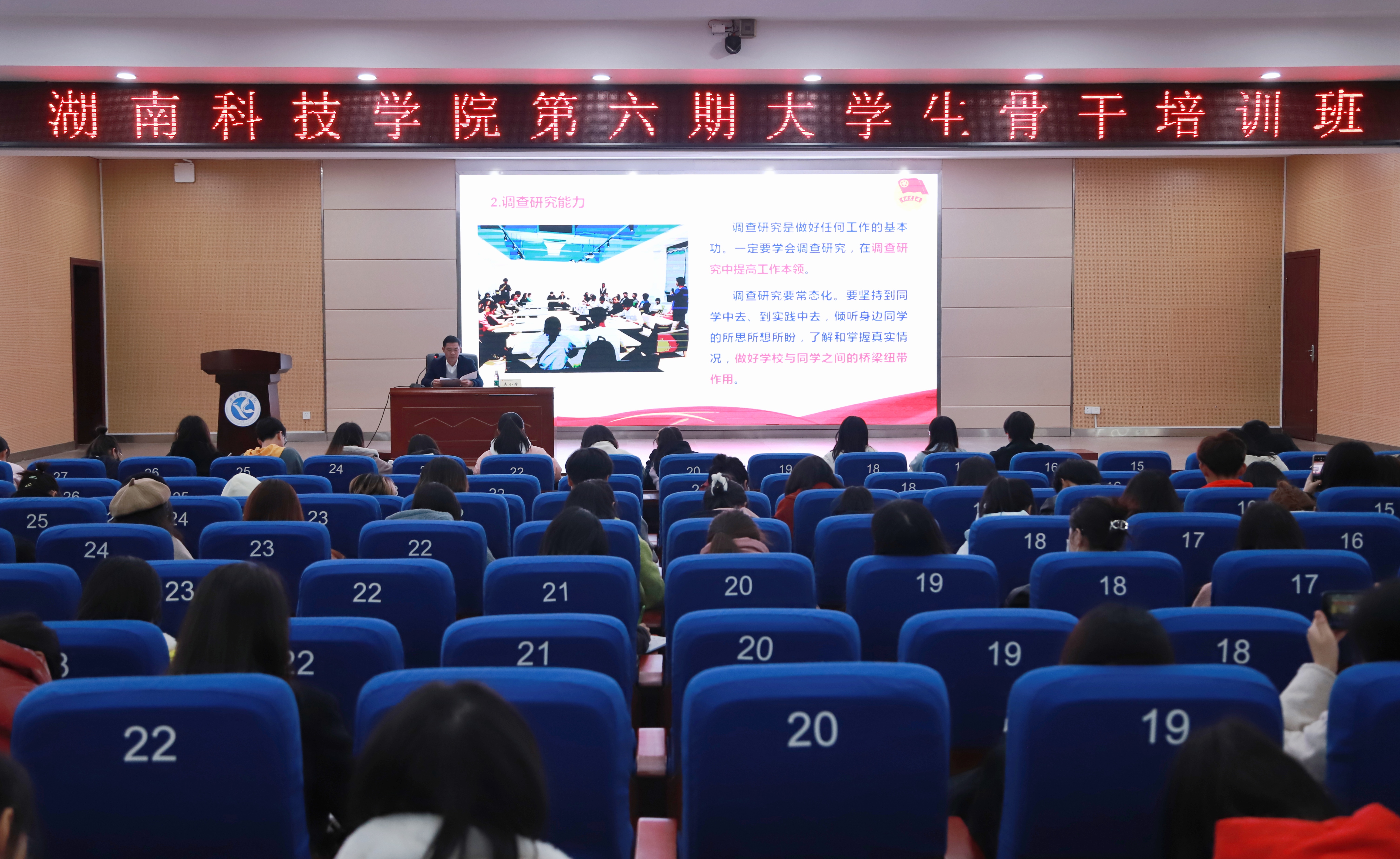本网讯(记者 龙雨帆)12月7日晚,世界杯官网第六期大学生骨干培训在潇湘大讲堂举行。校党委委员、副校长吴小林以“锤炼过硬本领、勇担时代大任,让青春在拼搏中闪光”为题为全体学员授课。团课由校团委书记万李主持。