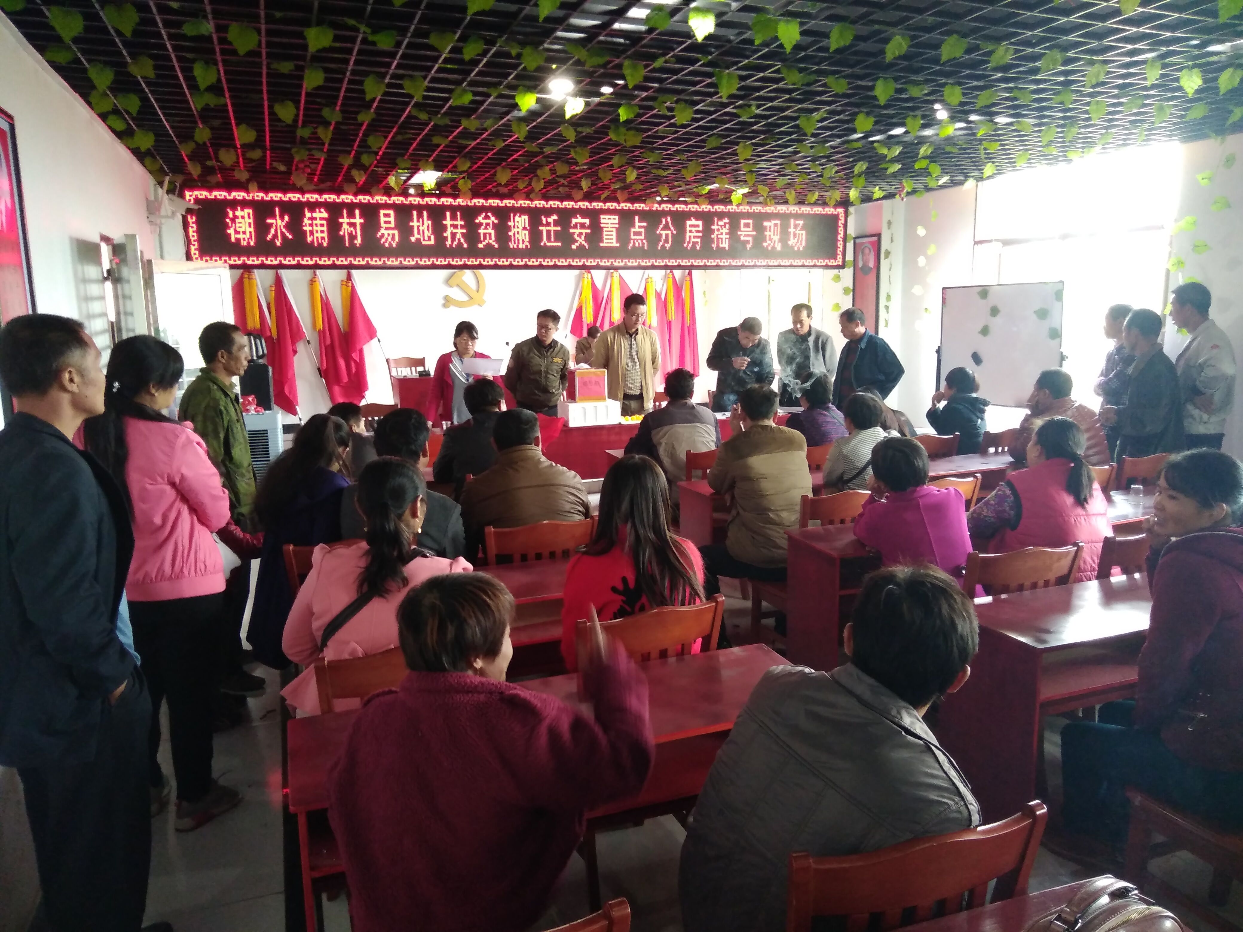 10月21日上午,潮水铺村及周边几个村参与易地搬迁贫困户在潮水铺村综合楼大会议室进行了分房,扶贫工作队队长贺幸福主持分房仪式。在公证处工作人员的公证下,通过摇号,贫困户们分得安置房。