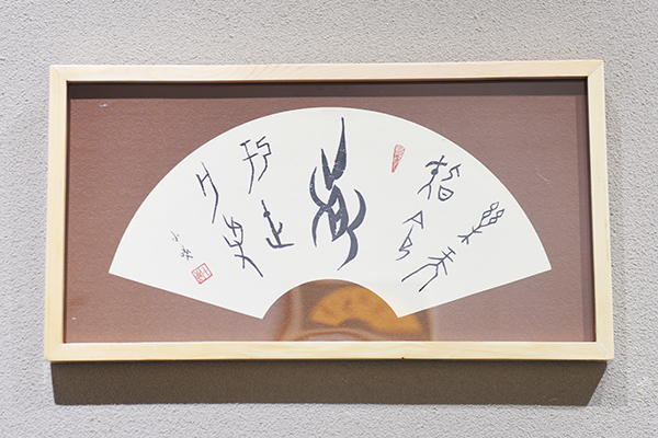 观展中,欧小松教授介绍了在女书书法创作中总结的四种形态:苗条型,丰腴型,婀娜型,拙朴型,分别展现出不同韵味的女书艺术美。本次作品展,欧小松教授还将女书与我国古代文字甲骨文、金文、小篆相结合,给人耳目一新之感受。