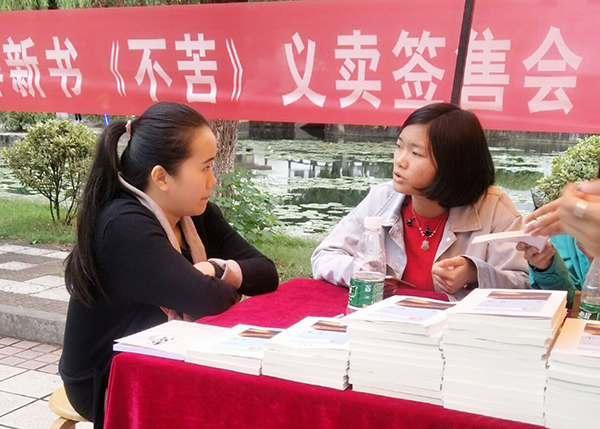 本网讯 10月14日,世界杯官网人文与社会科学学院14级学生龙夏萍新书《不苦》义卖签售会在爱莲湖畔举行,义卖善款将于重阳节,直接送到零陵区柳子街的困难老人手中。