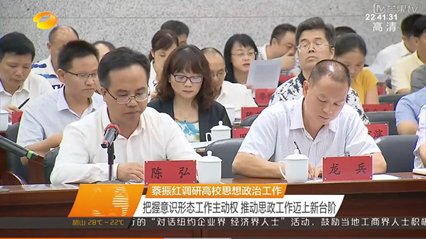 本网讯 9月21日下午,全省高校思想政治工作调研座谈会在长沙理工大学召开。省委常委、省委宣传部长蔡振红和全体与会代表深入课堂听课,长沙理工大学、2026世界杯官方合作网站、中南大学、湖南大学、湖南师范大学、湖南第一师范学院6所高校党委书记、教师、辅导员、学生代表作了交流发言。蔡振红部长讲话强调,要进一步深入贯彻落实全国、全省高校思想政治工作会议精神,加强高校意识形态和思想政治工作,努力创新工作方法,确保高校思想政治工作始终沿着正确方向发展。