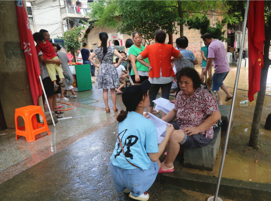 7.2”洪灾过后的大西门社区,地上裹着厚厚的淤泥,墙角、路傍、沟畔等堆积着许多被洪水冲击集聚的垃圾废品。 “理学星空服务调研团志愿者”一行20多人于73日下午2:30早早赶到大西门社区,在社区负责人的带领下,他们来到正大街、小西门、鼓楼巷、总督巷等大街小巷开展志愿服务活动。大家来不及休息,迅速投入到淤泥清理,防疫知识普及,社区受灾家庭卫生清理等工作当中。志愿者们不惧脏累,有的拿起扫帚和铲子清理灾后卫生死角,有的帮助受灾家庭搬运电冰箱、电视机沙发等物品;有的到群众家里发放宣传资料与群众宣讲洪灾过后的疾病防预工作;有的把大水浸泡的旧沙发、被子、衣服一一搬走。