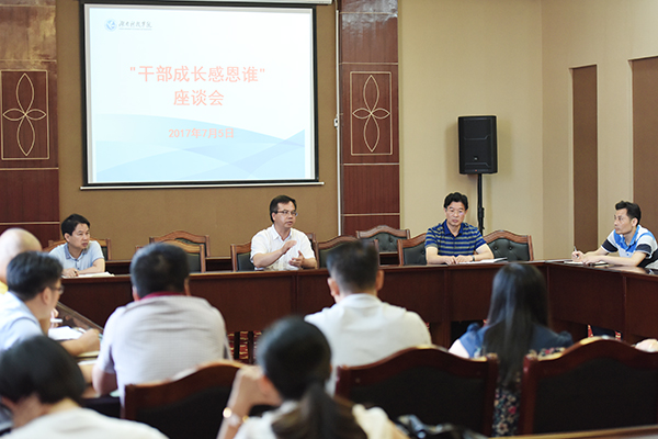 本网讯  7月5日下午,校党委书记陈弘与来自全校的30余名干部代表,围绕“干部成长感恩谁”主题进行座谈。党委委员、副校长宋宏福、李常健出席,座谈会由宋宏福主持。