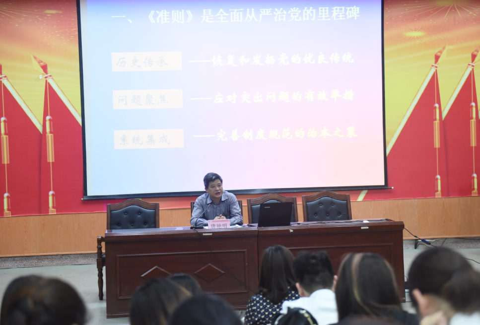 唐艳明以“加强和规范党内政治生活”为主题,从《准则》是全面从严治党的里程碑、全面理解《准则》的重要规定、让《准则》在世界杯官网落地生根三个方面对《准则》进行解读并引导学员深入思考。