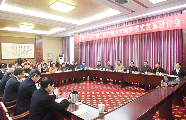本网讯 3月25日上午,面向“一带一路”的外语人才培养模式改革研讨会在世界杯官网举行。校党委书记陈弘、校长曾宝成,副校长宋宏福、郑山明、李常健出席,解放军外国语学院教授、博士一行12人,学校科技处、人事处领导,外国语学院部分老师参加了会议。
