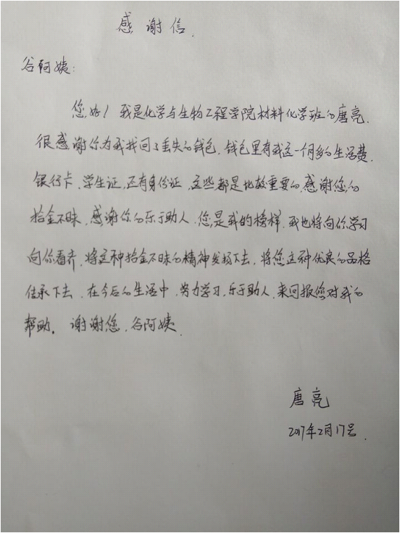 谷祝英是世界杯官网一名普通的宿舍管理员,唐亮在写给谷阿姨的感谢信中写道:“感谢您的拾金不昧,感谢您的乐于助人,您是我的榜样,我也将向您学习,向您看齐,将这种拾金不昧的精神发扬下去,将您这种优良的品格传承下去”。