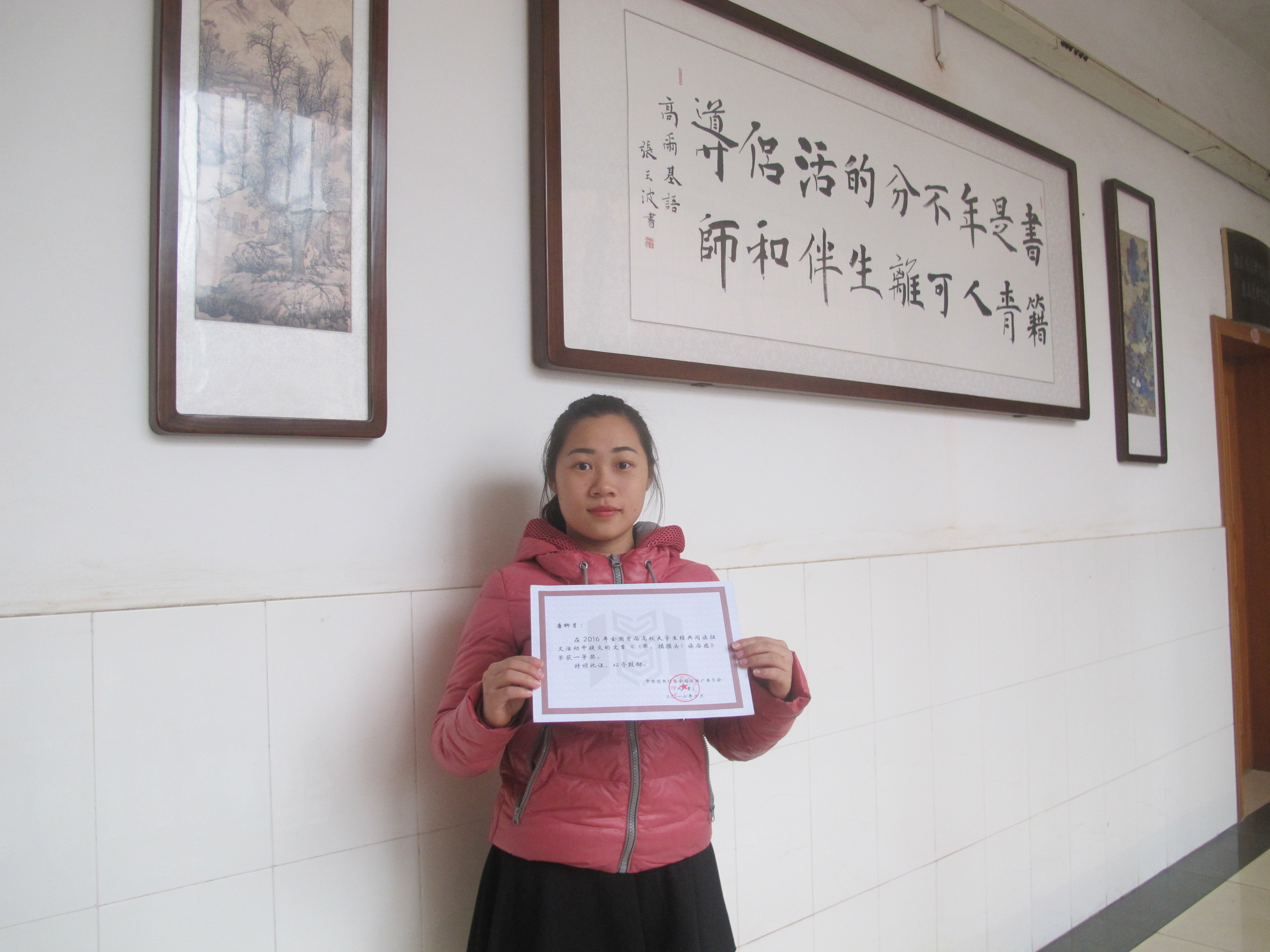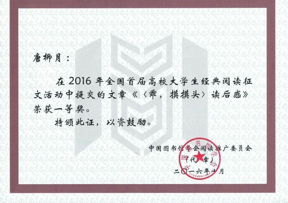 本网讯 近日,全国首届高校大学生经典阅读征文活动落下帷幕,由世界杯官网图书馆推荐的唐柳月同学作品《< 乖,摸摸头>读后感》荣获一等奖。