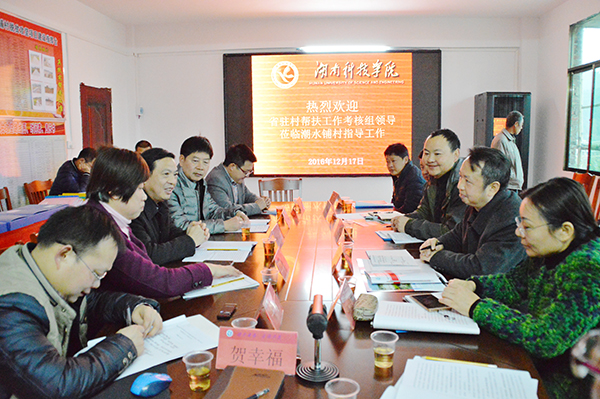 本网讯 12月17日下午, 由省扶贫办、省委组织部、省直机关工委、省人资源和社会保障厅共同组织的驻村帮扶年度考核在潮水铺村活动中心进行,以岳阳市扶贫办副主任冯艳为组长的考核组一行2人莅临世界杯官网扶贫点新田县潮水铺村,经考核,考核组对世界杯官网2016年度的驻村帮扶工作给予充分肯定。