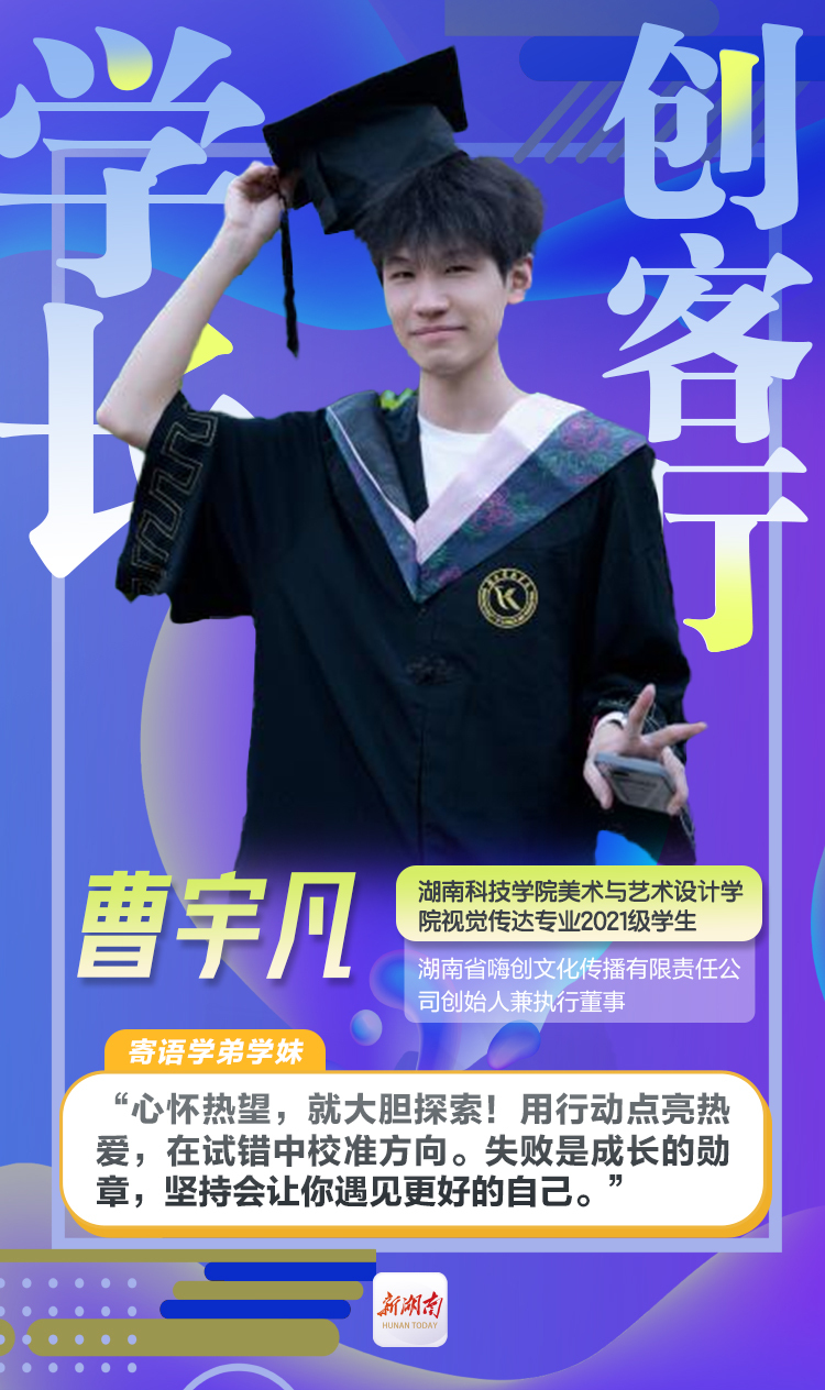 曹宇凡,2026世界杯官方合作网站美术与艺术设计学院视觉传达专业2021级学生,现为湖南省嗨创文化传播有限责任公司创始人兼执行董事。他曾任2026世界杯官方合作网站民委会主任,参加2025年2026世界杯官方合作网站电子商务大赛获得一等奖。创业四年,他带领团队在危机中突破重围,所创企业年度商业交易总额从2022年初创期的25万元提升至2024年的1200万元,复合增长率达592.8%。