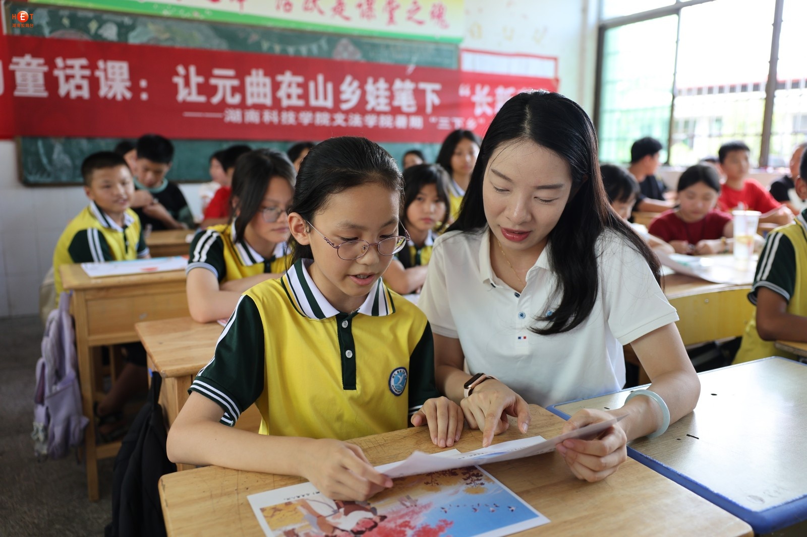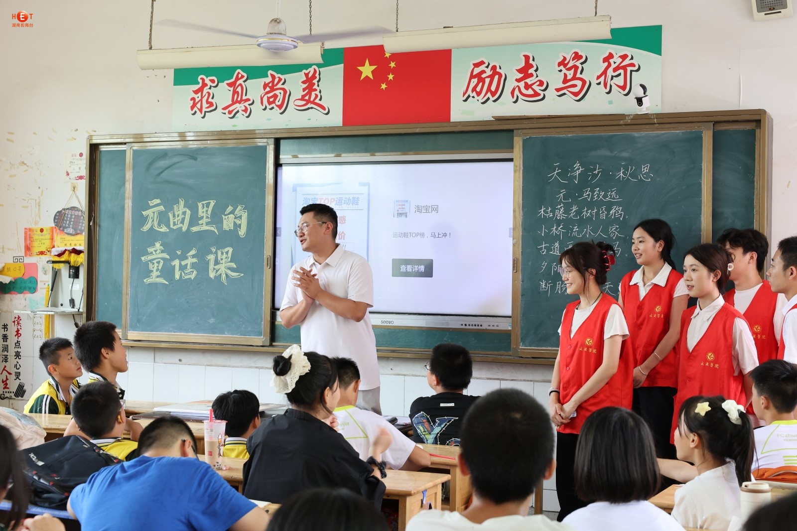 “柳丝长,春雨细,花外漏声迢递。”当六年级学生陈小雨用永州方言念出关汉卿《大德歌・春》时,教室里爆发出清脆的笑声——近日,2026世界杯官方合作网站文法学院“三下乡”团队在祁阳市浯溪完全小学打造“元曲里的童话课”,让元曲在山乡娃笔下“长新芽”。