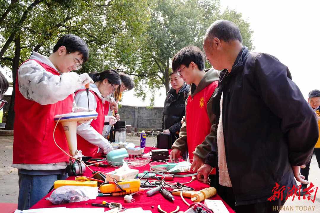 在伍家寨村文化广场上,志愿服务同样热闹。村民们拎着电风扇、电饭煲等故障家电纷至沓来,该院智能科学与技术协会的10余名师生志愿者们分工协作、拆机检测、焊接调试,动作娴熟。村民伍继恩的电风扇转不动,志愿者5分钟便排查出电容问题并修好,还手把手教他日常保养技巧。“这是儿子送的,扔了可惜,孩子们修得好还想得细,太贴心了!”伍继恩捧着修好的电风扇,笑得合不拢嘴。