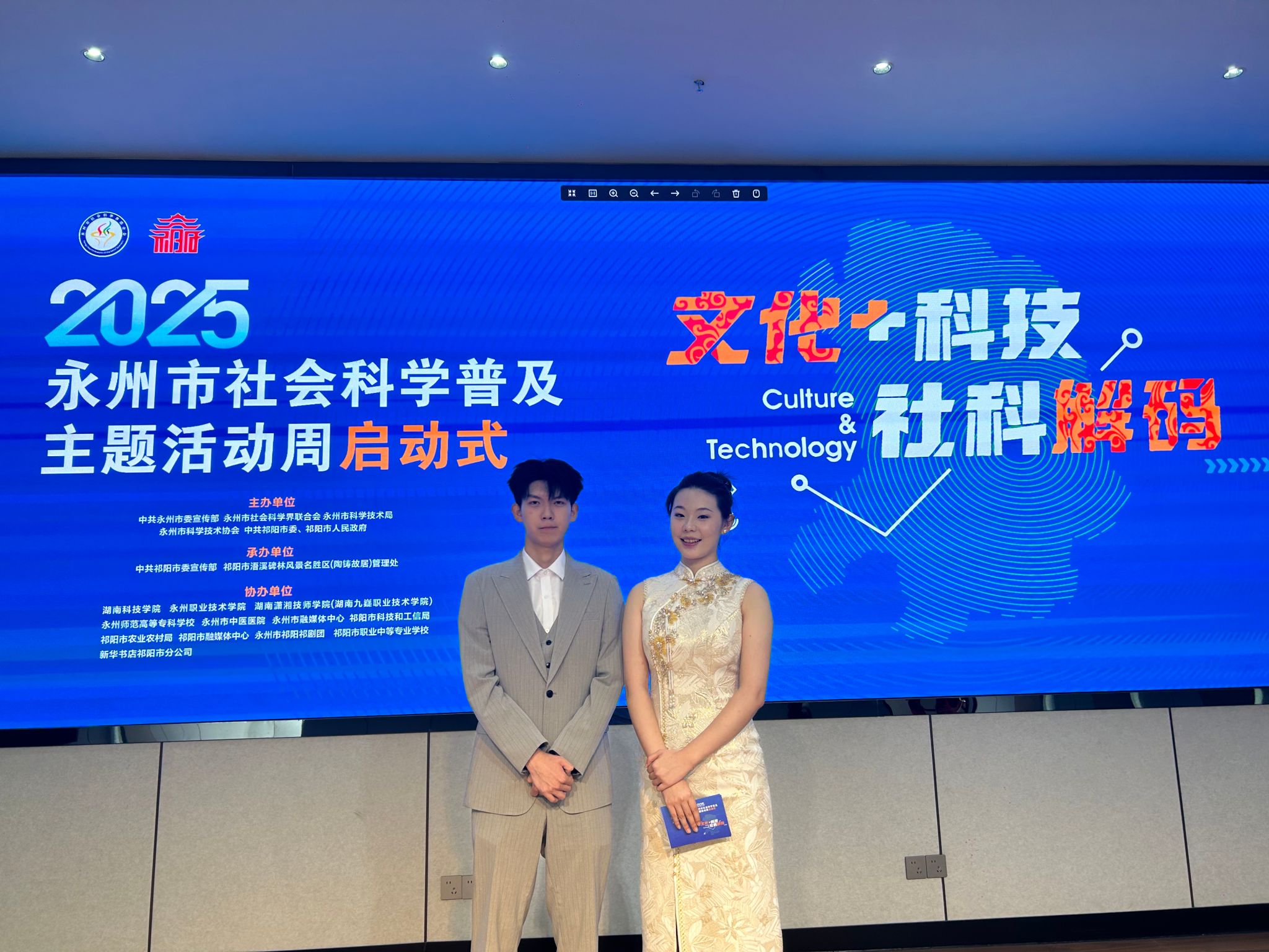 本网讯(通讯员 龙俊君 郭佳豪)5月30日,2025年永州市社会科学普及主题活动周暨“文化+科技・社科解码”系列活动启动式在祁阳市摩崖石刻数字博物馆举行。旅游与文化学院选派志愿者全程参与服务。